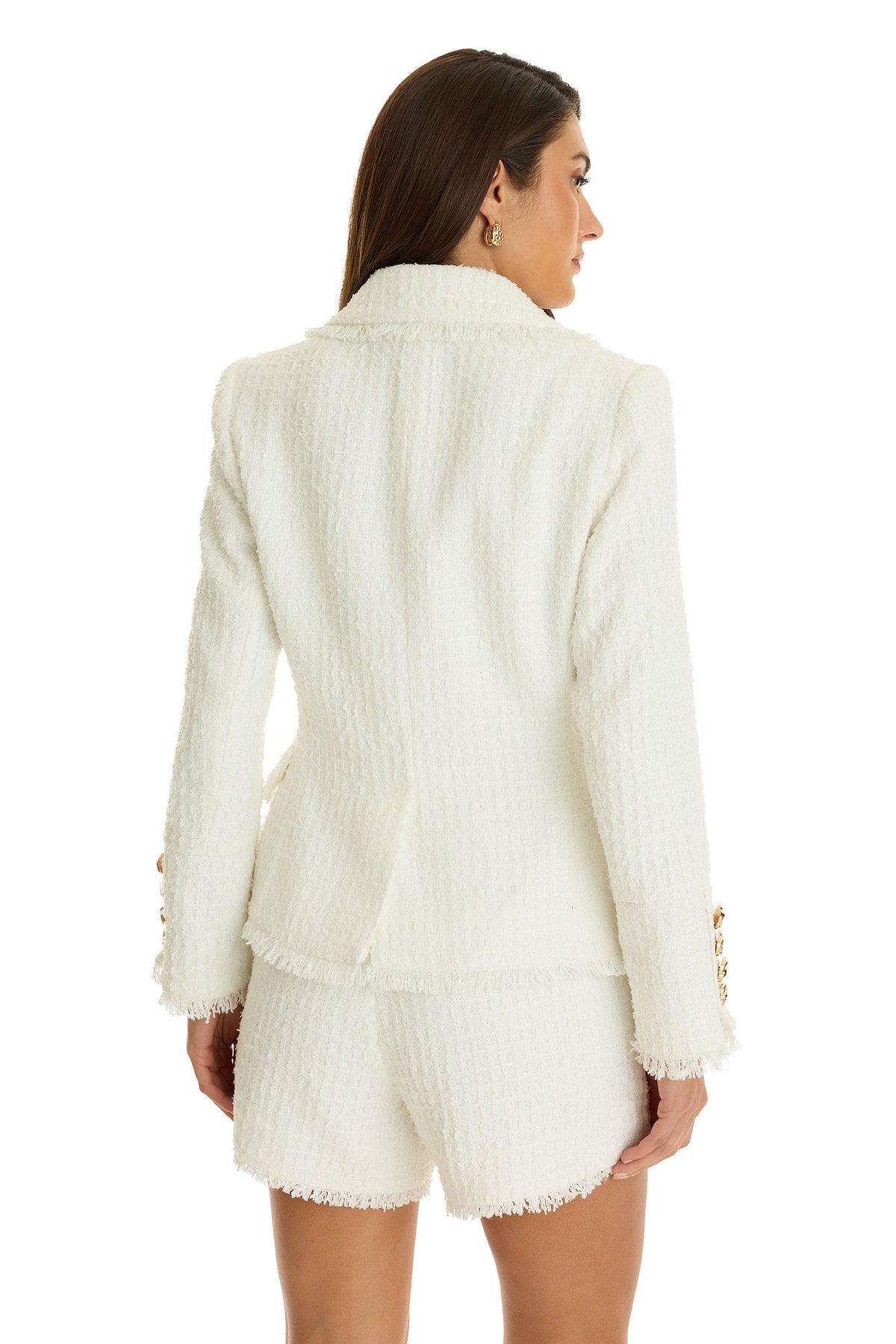 Scopri il tuo nuovo pezzo di potere preferito. Il Blazer Giselle presenta un lussuoso tweed testurizzato, spalle imbottite scolpite e bottoni a nodo dorati per un tocco extra di eleganza. Completamente foderato con tasche a patta e una vita su misura che valorizza ogni silhouette, abbina questo pezzo ai nostri iconici jeans o ai pantaloni corti coordinati Tamara. Eleganza con attitudine—questo è il blazer che fa tutto.