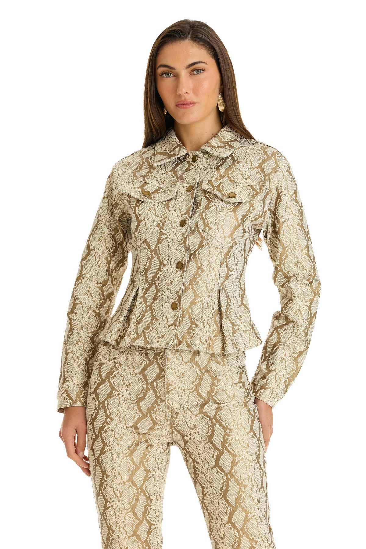 Presentiamo la Giacca di Jeans Bethanie, dove la sartoria senza tempo incontra un tocco contemporaneo. Questo pezzo sofisticato presenta una straordinaria stampa di serpente metallica abbinata a bottoni dorati lucenti che catturano splendidamente la luce. Il colletto a punta e le maniche lunghe offrono una struttura elegante, mentre le doppie tasche sul petto uniscono praticità e stile. Un orlo a peplo plissettato aggiunge una dimensione inaspettata al taglio classico, creando una giacca che attira l'attenzione sia che sia indossata in modo elegante che informale.
