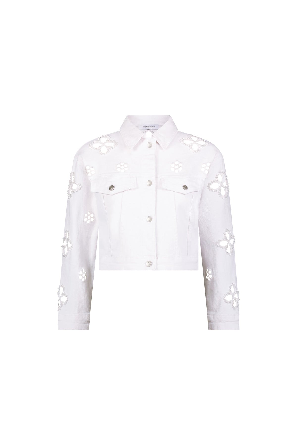 La Giacca Kaia Pearl è la tua giacca di jeans, reinterpretata. Leggera e morbida nella struttura, questa silhouette corta è decorata con perle e perline floreali su tutta la superficie — uno strato romantico senza sforzo con il giusto tocco di audacia.
