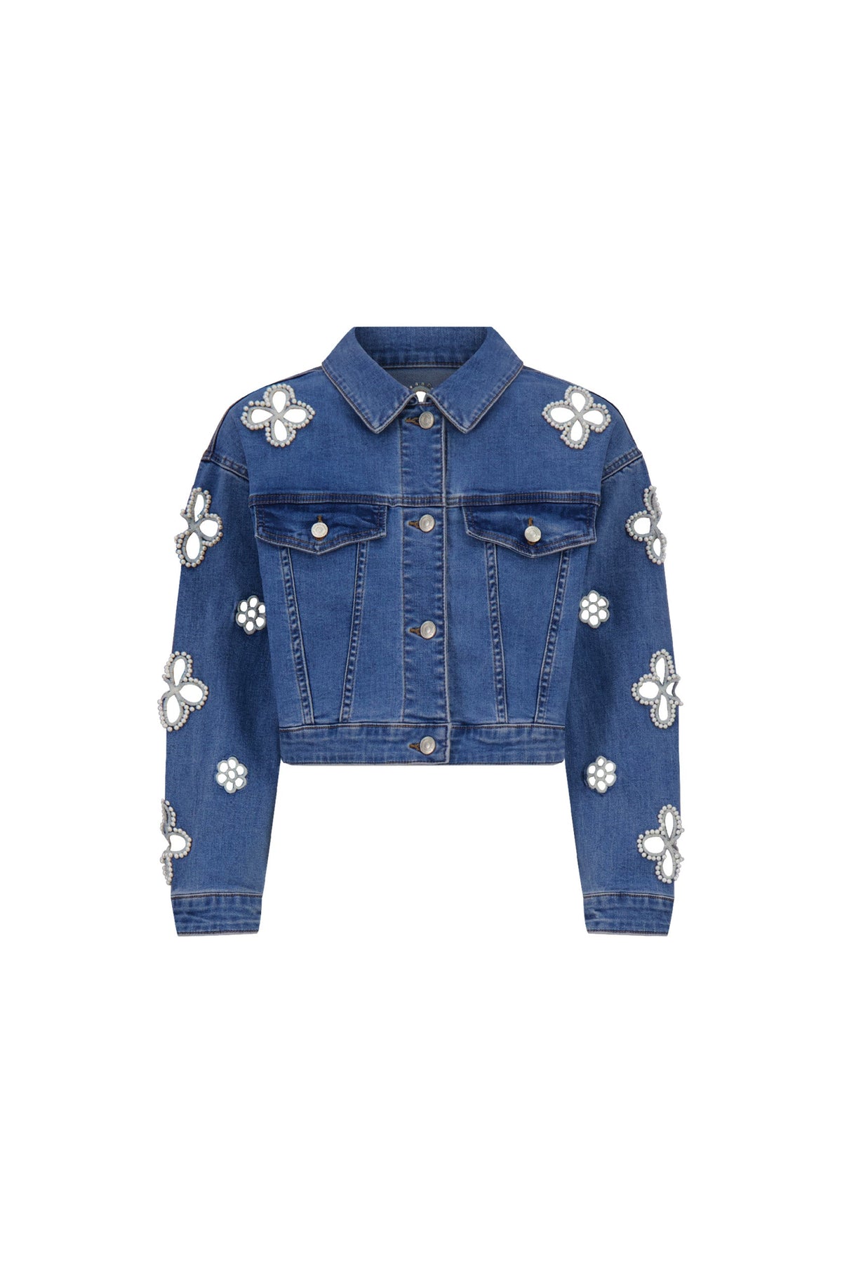 La Giacca Kaia Pearl è la tua giacca in denim, reinventata. Leggera e leggermente strutturata, questa silhouette cropped è adornata con perle e perline floreali su tutta la superficie — uno strato romanticamente senza sforzo con il giusto tocco di audacia.