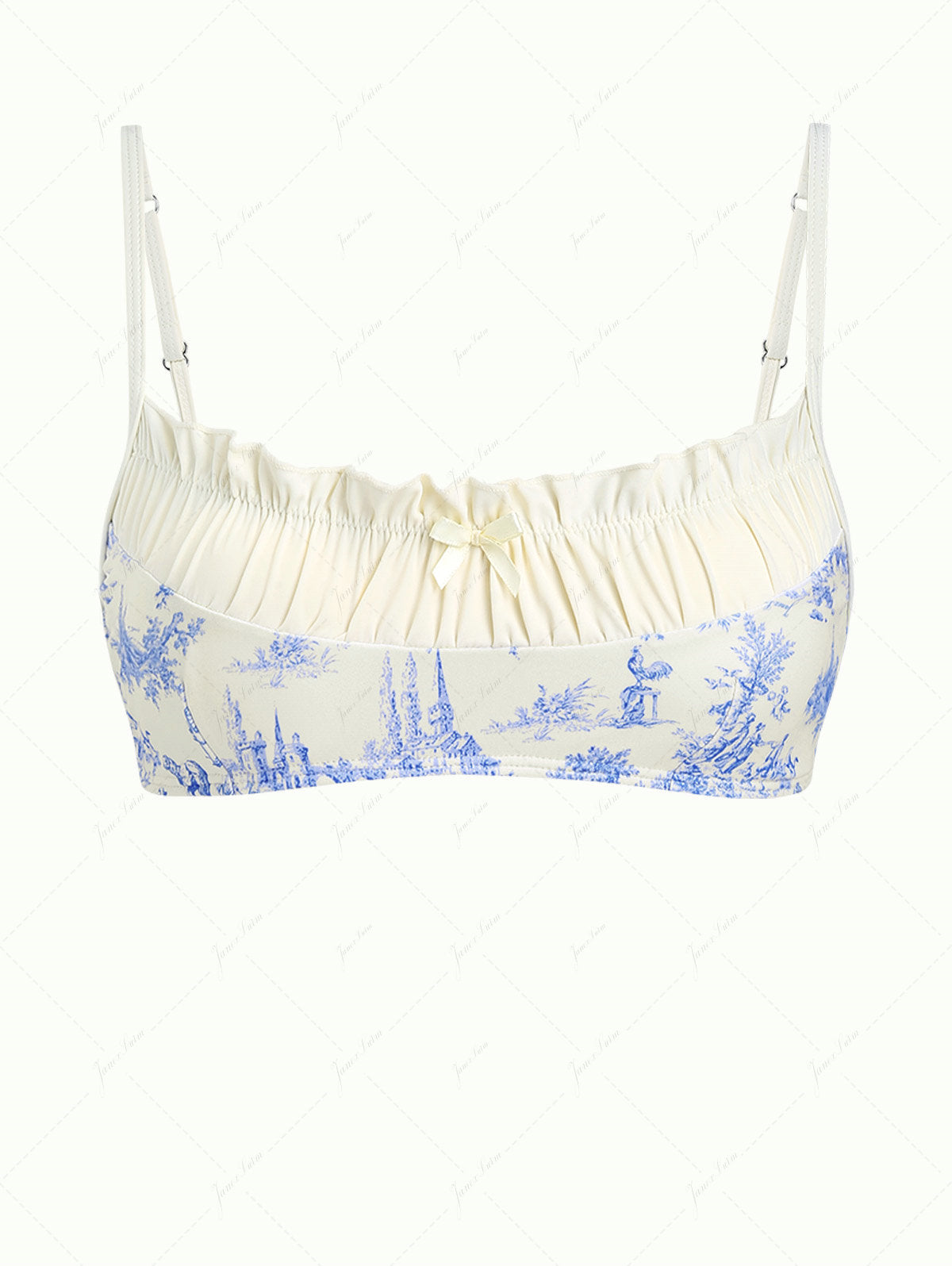 Top Bikini Arricciato con Rouches Spliced in Crema di Cristallo Toile de Jouy