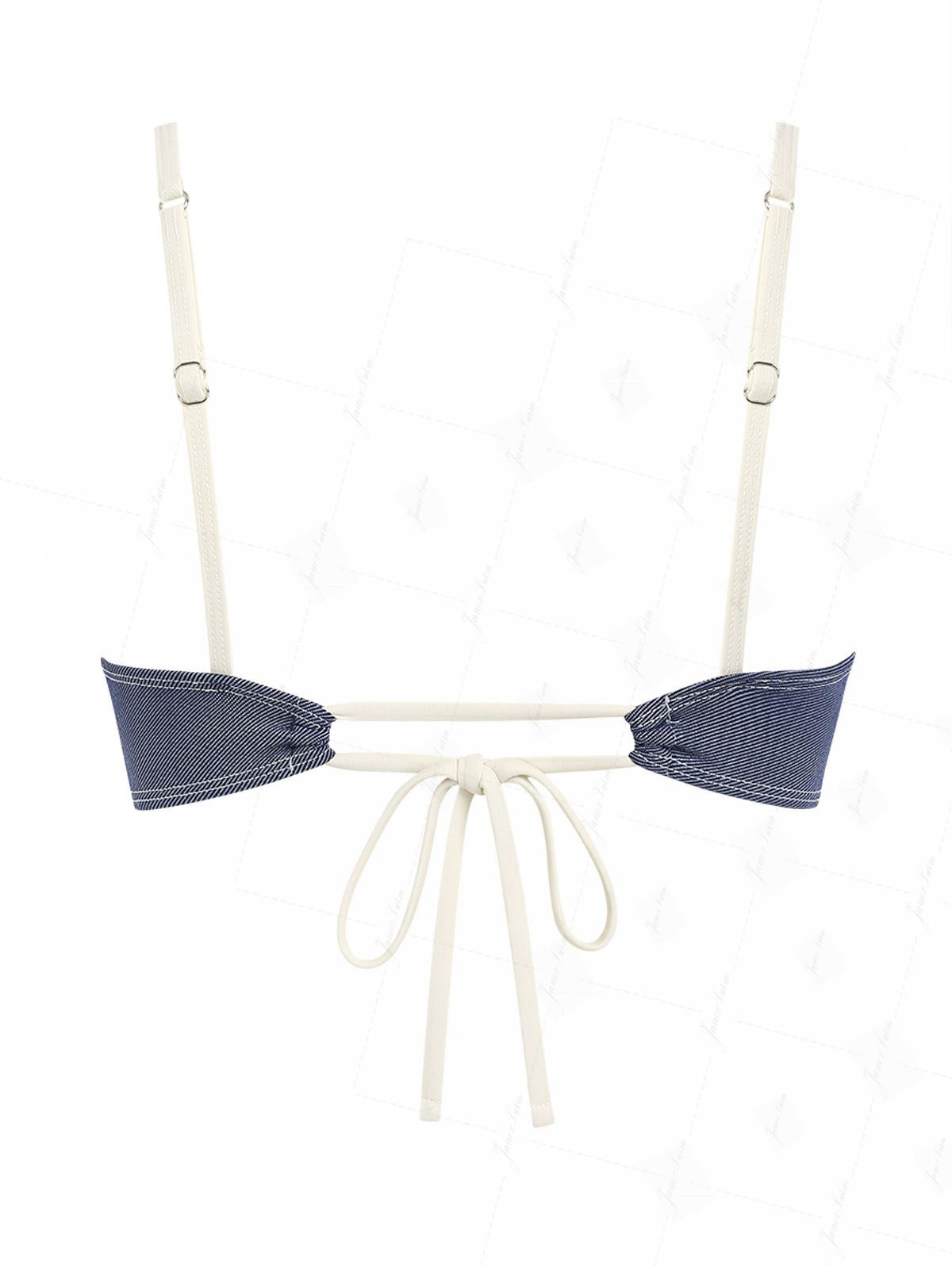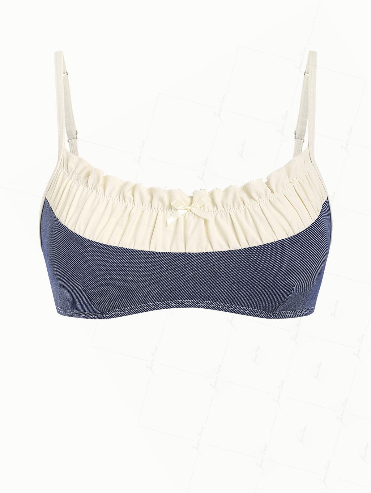 Top bikini con rouches arricciati e fiocco in denim blu profondo