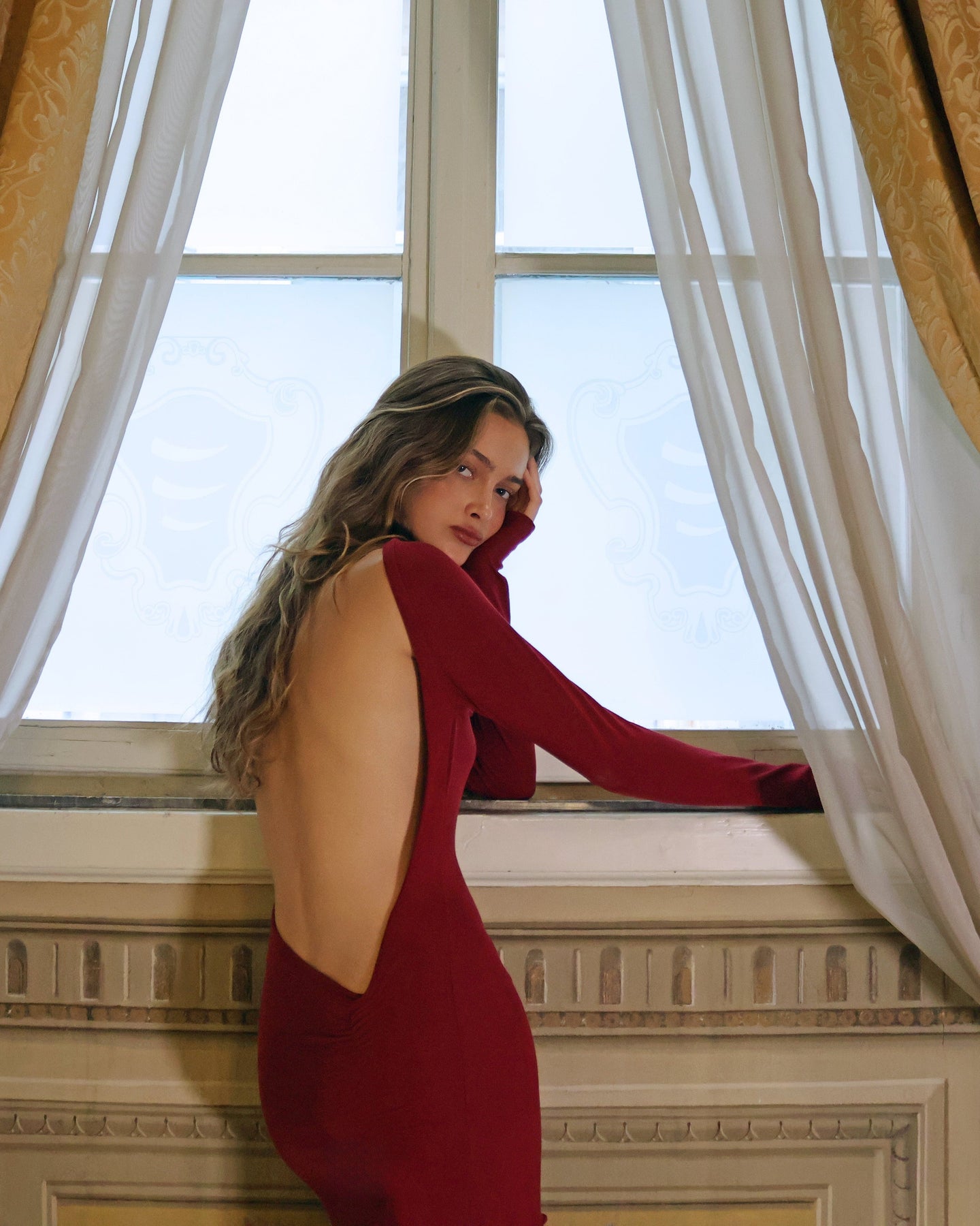 L'Abito Prima è la definizione di glamour discreto. La sua straordinaria schiena scoperta, le lunghe maniche scultoree e la silhouette fluida che sfiora il pavimento creano un look drammatico ma senza sforzo. Finitura in un ricco rosso festivo con una morbida spaccatura laterale, si muove con te in modo splendido—perfetto per serate festive, celebrazioni invernali e quei momenti speciali.