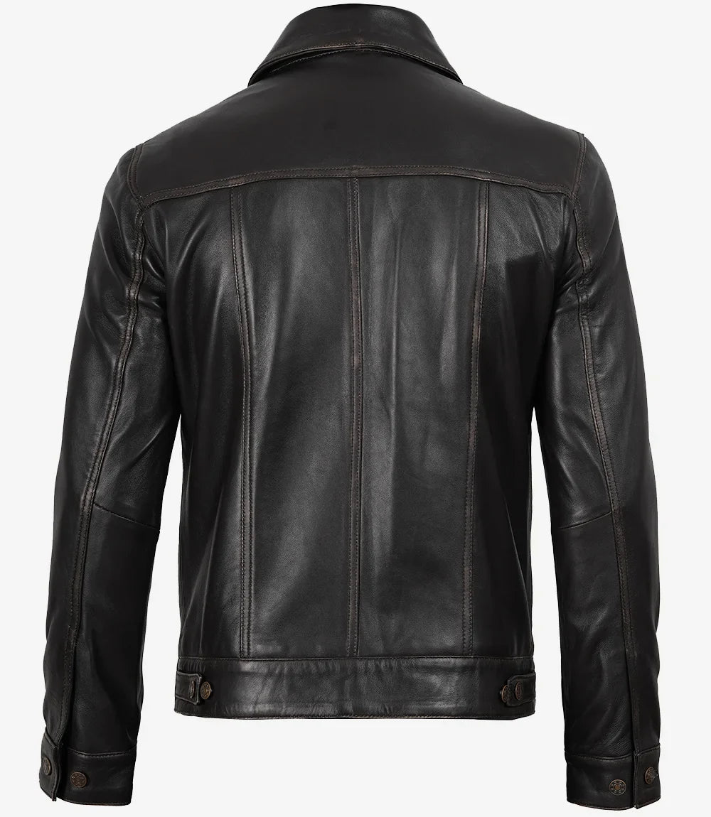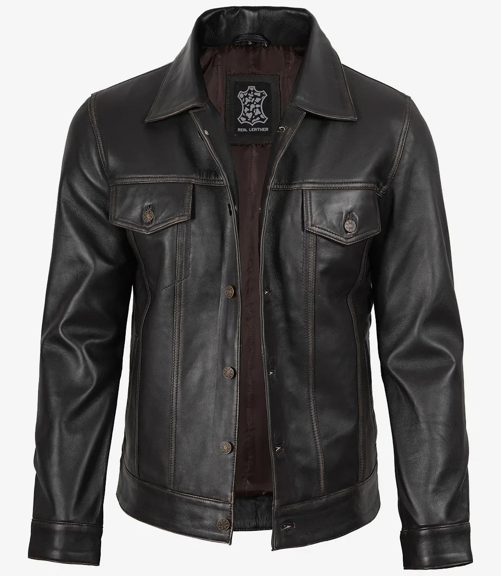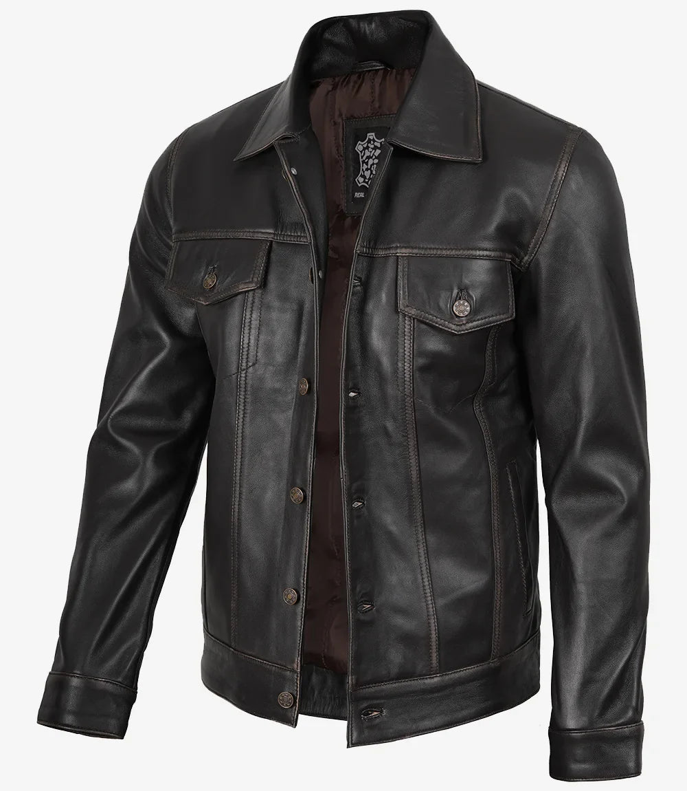 Giacca da camionista in pelle marrone invecchiata per uomo