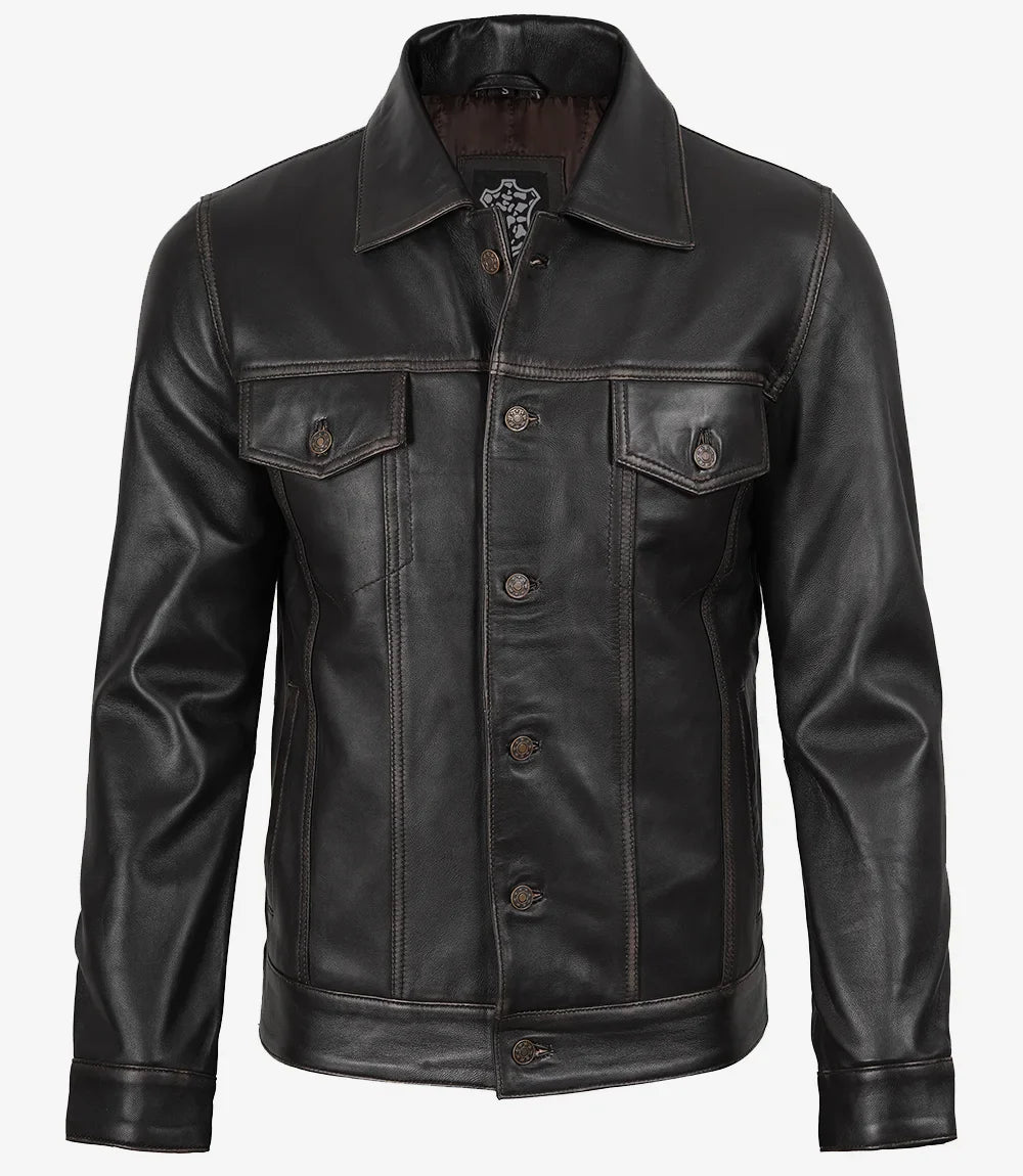 Scopri la giacca da camionista in pelle marrone invecchiata per uomo. Realizzata in morbida pelle di agnello, presenta un design classico e tasche pratiche. Ideale per l'uso quotidiano, darà un tocco casual ai tuoi outfit. Perfetta in ogni occasione!