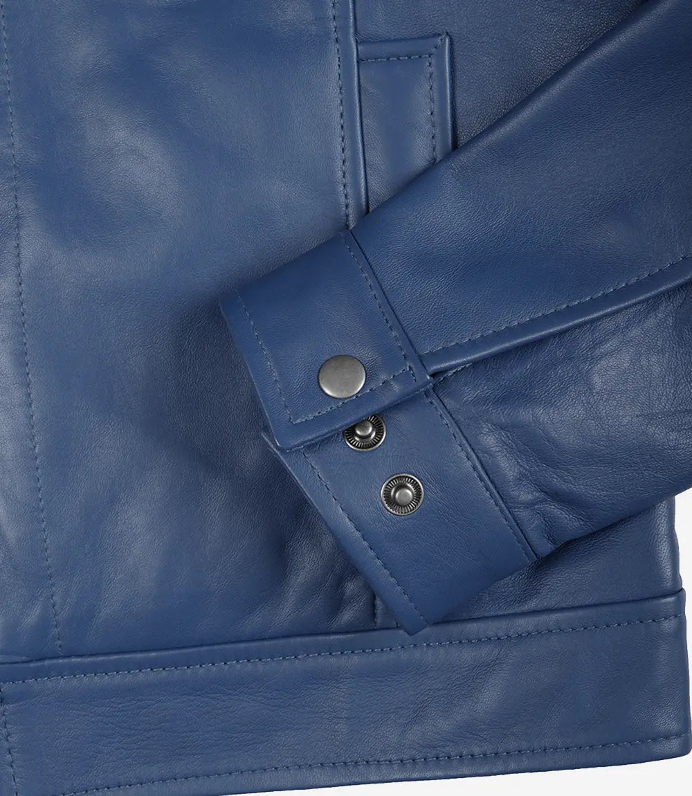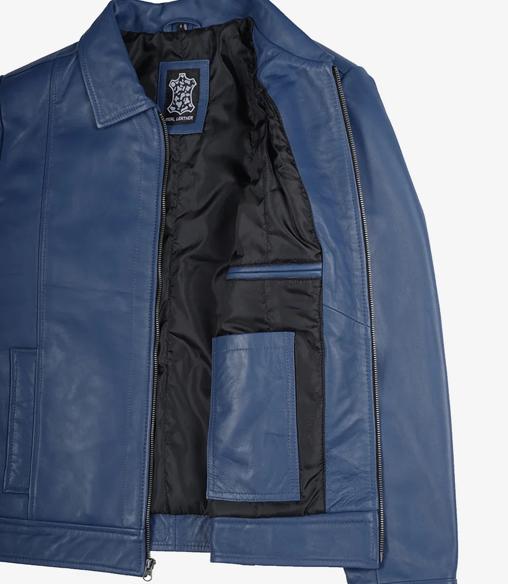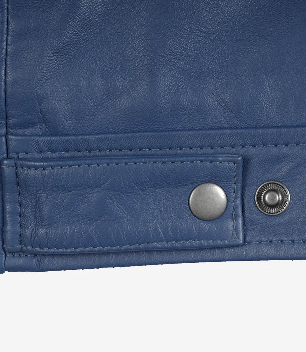 Trova il compagno ideale per i tuoi spostamenti quotidiani con questa giacca in pelle blu. Realizzata in vera pelle di agnello, è completamente foderata in morbido poliestere.