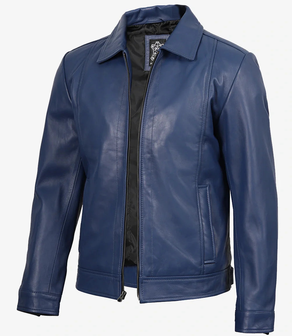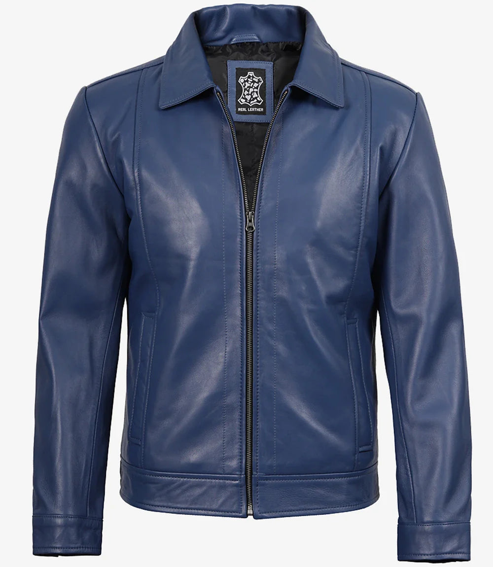 Giacca in pelle blu classica per uomo con colletto a camicia