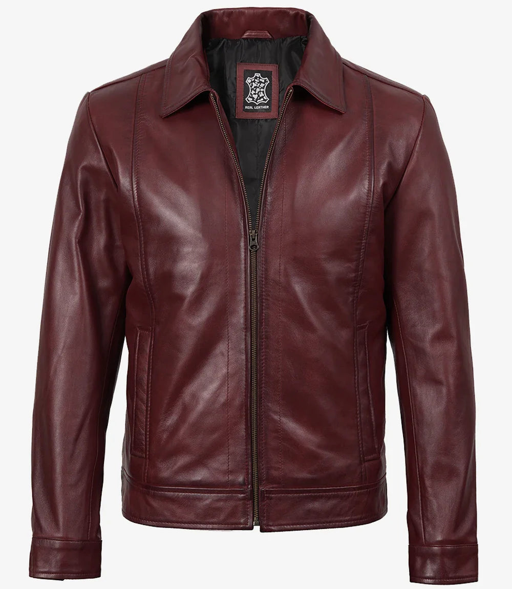 Giacca in pelle bordeaux Harrington con colletto classico per uomo