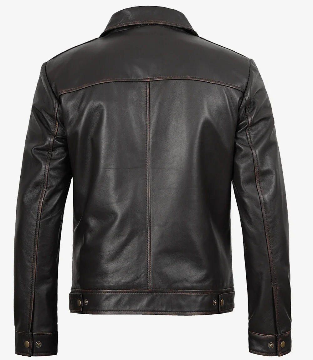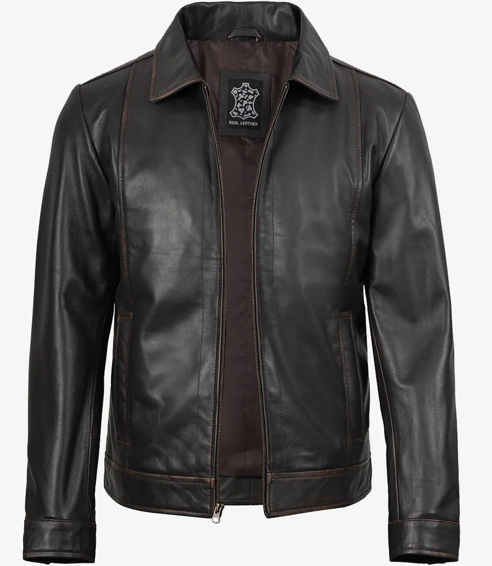 Giacca in pelle marrone invecchiata classica con colletto per uomo