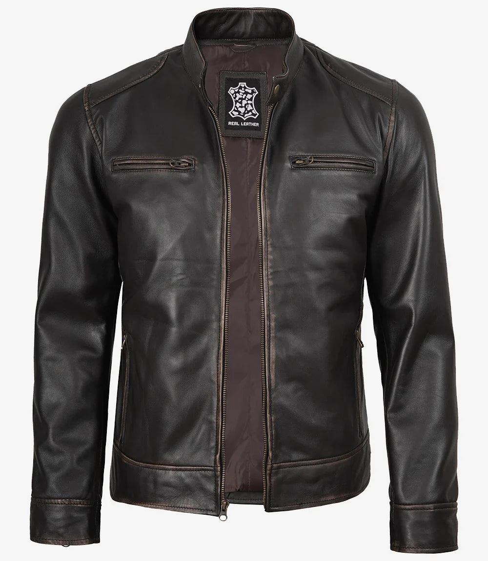 Giacca in pelle marrone invecchiata stile motociclista per uomo