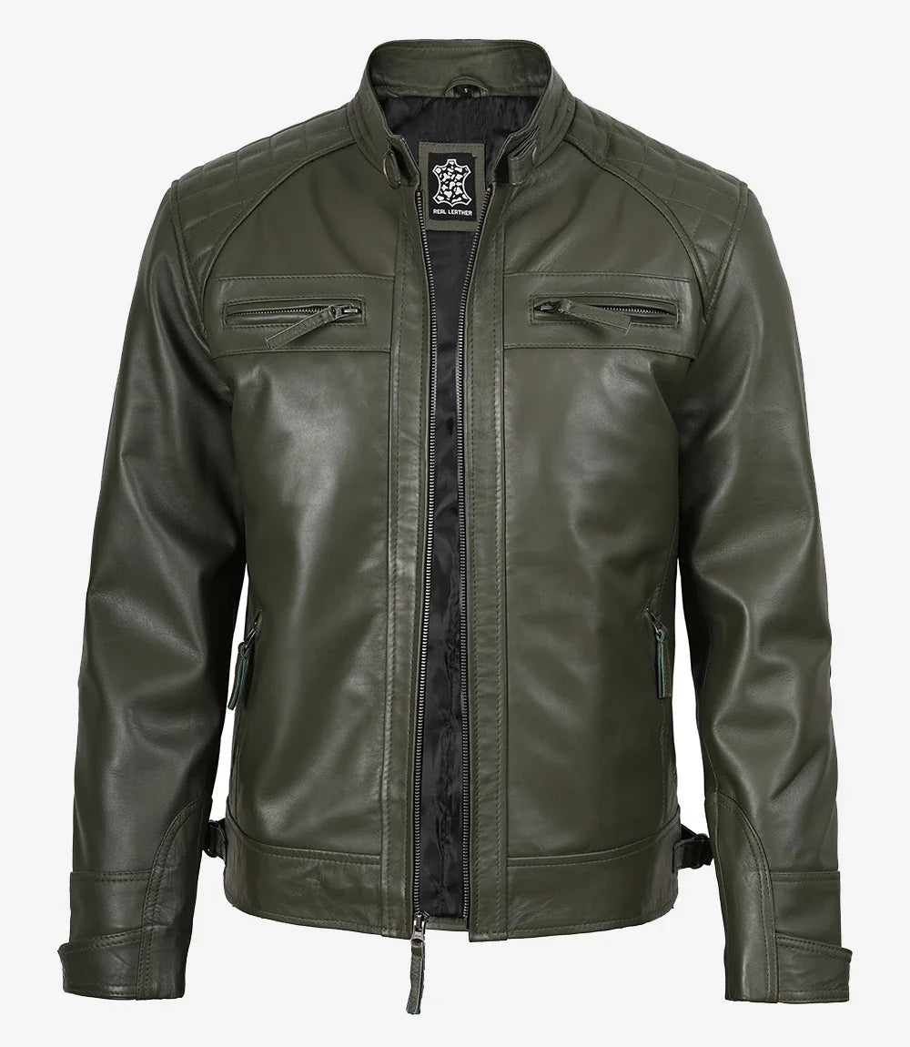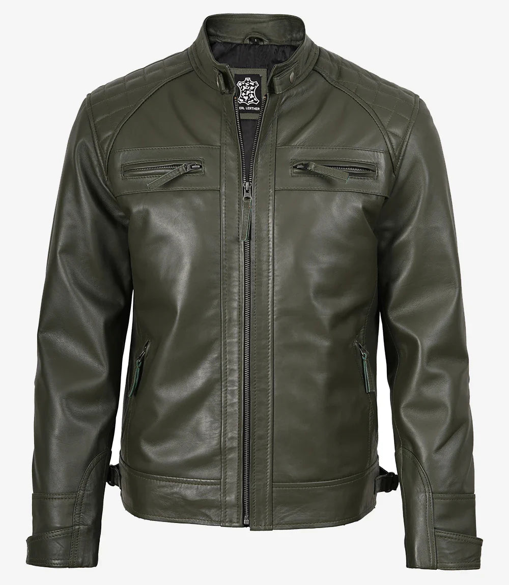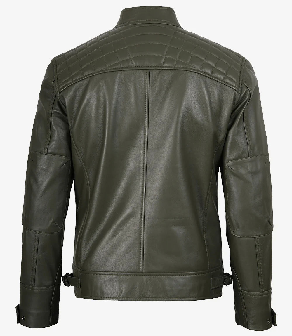 Giacca in pelle verde oliva stile motociclista per uomo con spalle imbottite