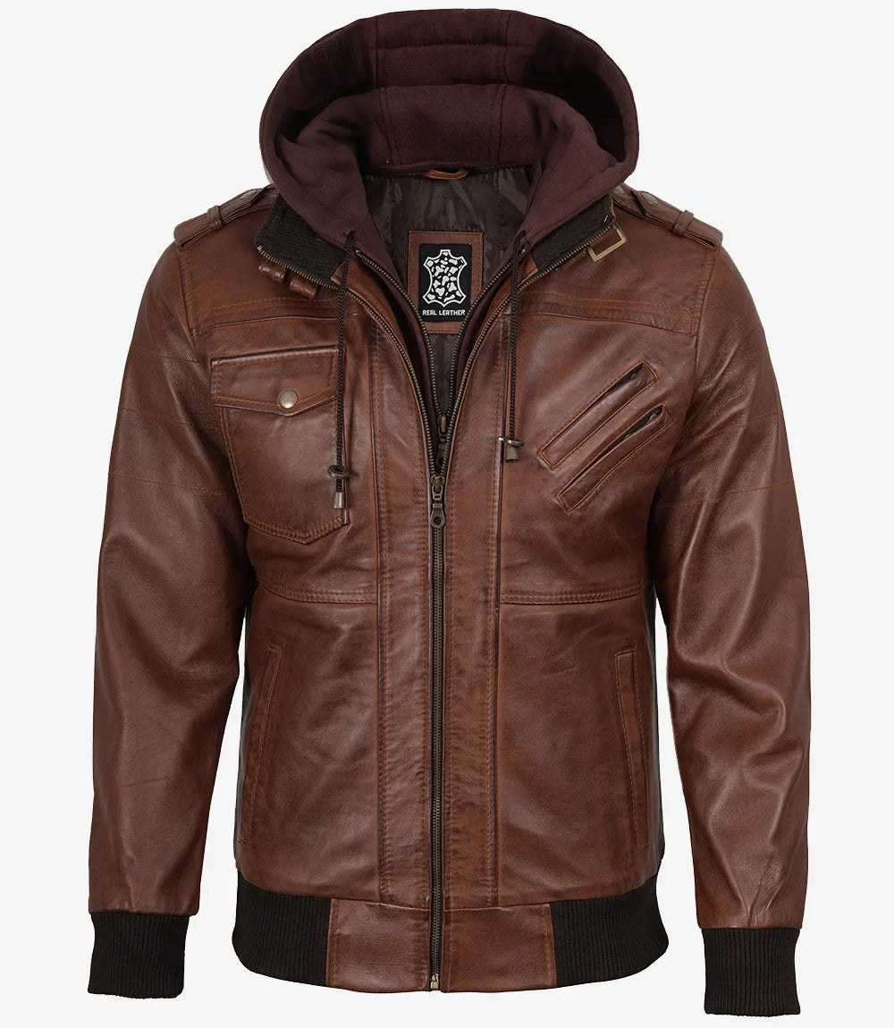 Giubbotto da aviatore in pelle cognac per uomo con cappuccio removibile