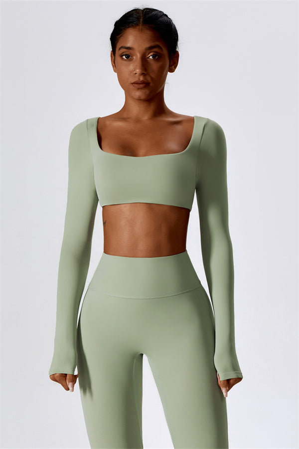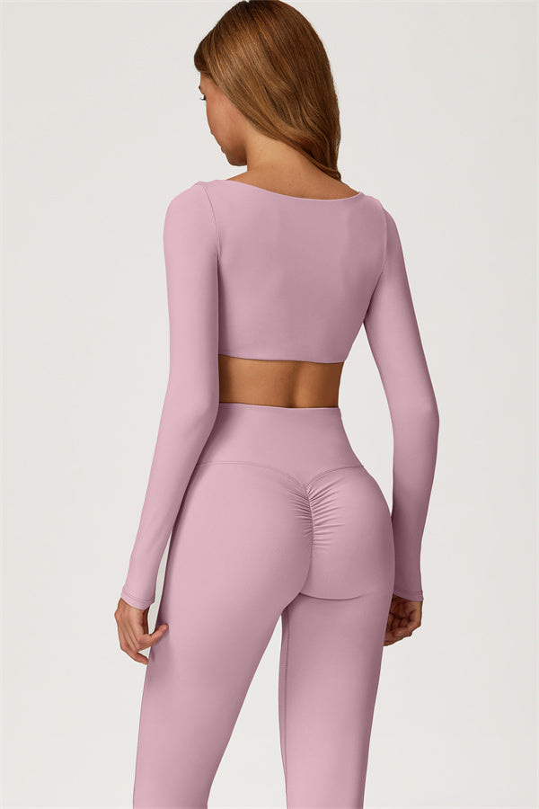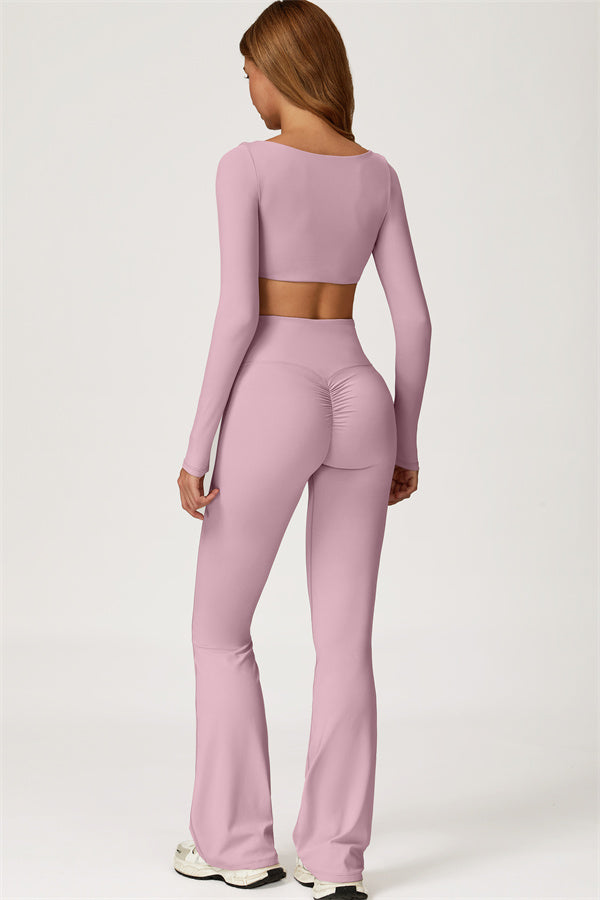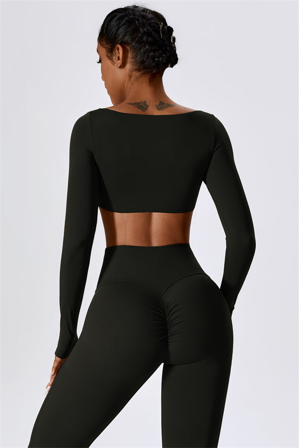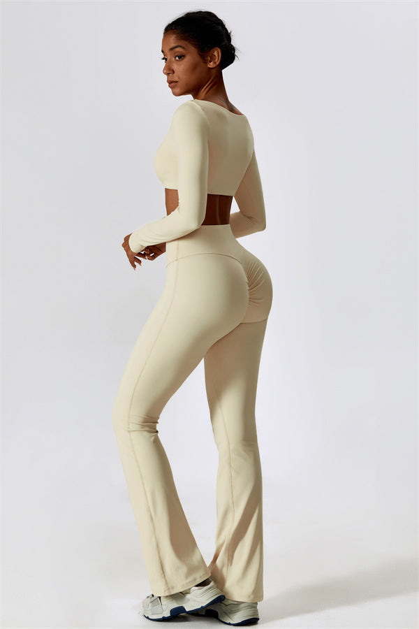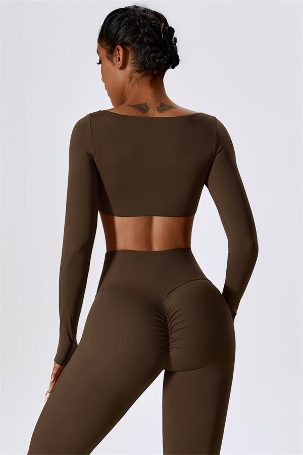 Questo elegante set coordinato, composto da un top a maniche lunghe e leggings, è progettato per migliorare sia il comfort che le prestazioni. Il top presenta un ampio scollo che si adatta perfettamente alle spalle, mentre il taglio a lunghezza media mette in risalto delicatamente la tua vita. Il design scolpito dei leggings con vita arricciata accentua le tue curve e solleva il tuo fondoschiena per una forma meravigliosamente contornata.