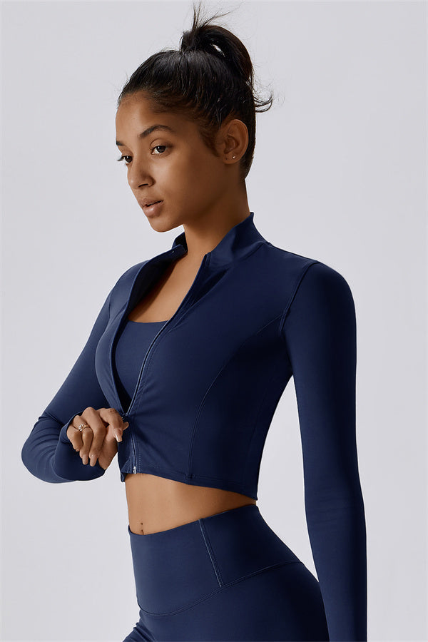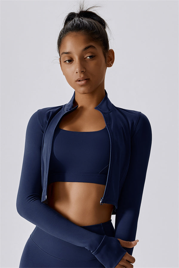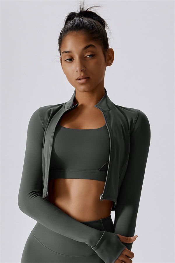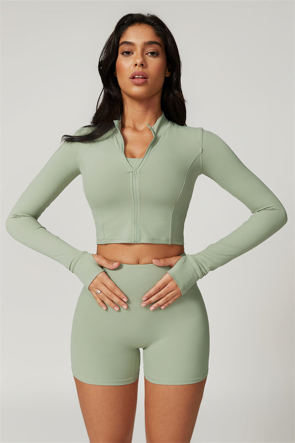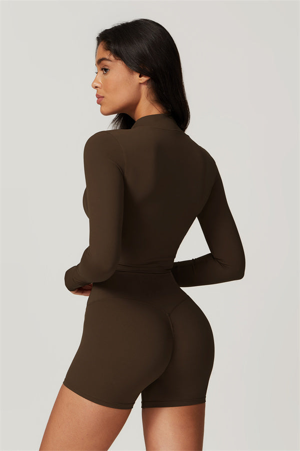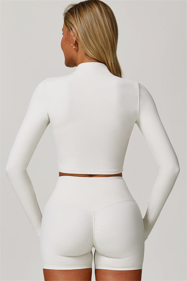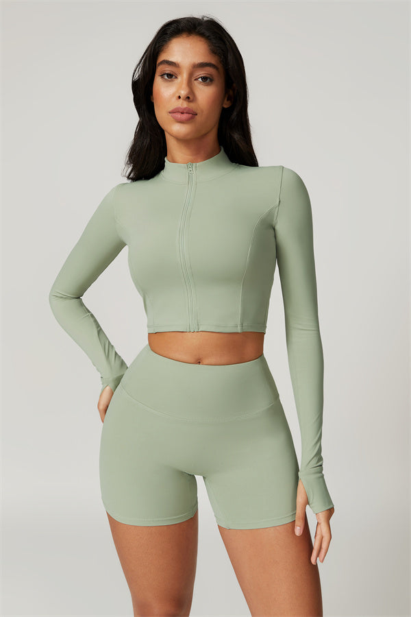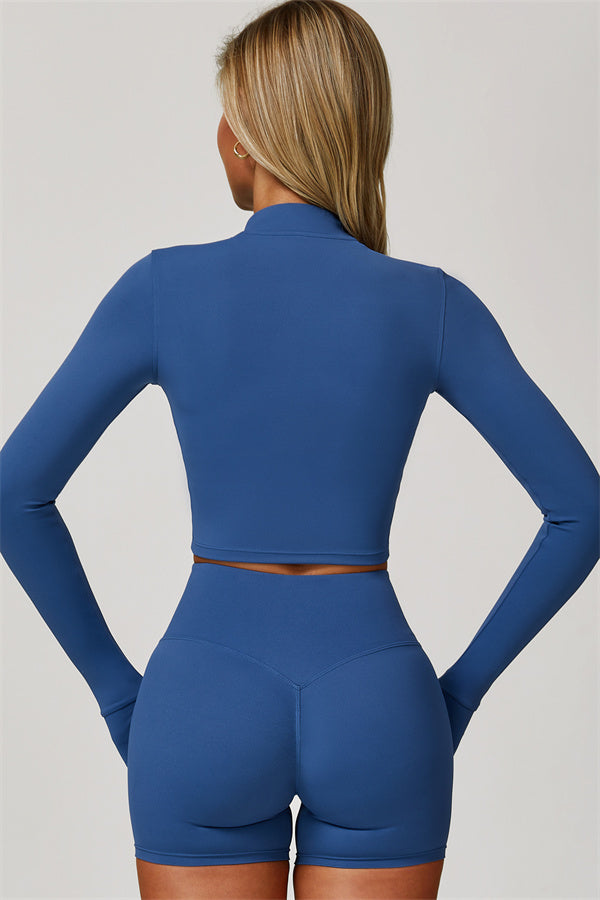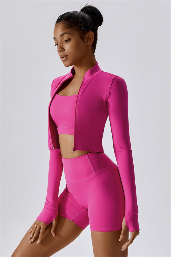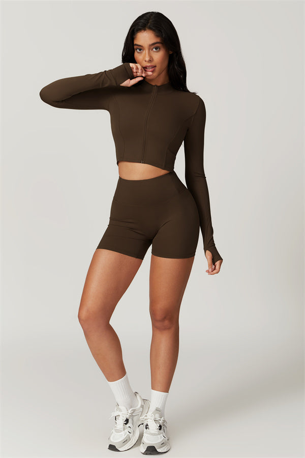 Questo elegante set coordinato include una giacca, un bra sportivo e pantaloni corti, progettati per offrire sia comfort che prestazioni. La giacca presenta un moderno colletto alto con una cerniera completa, permettendoti di regolare il tuo look e rimanere comoda durante gli allenamenti o le uscite informali. Le ampie spalline incrociate sul retro mettono in risalto le tue spalle e creano una silhouette lusinghiera. La sua struttura curva sul davanti accentua la tua figura, mentre i dettagli plissettati sul retro modellano e valorizzano le tue curve.