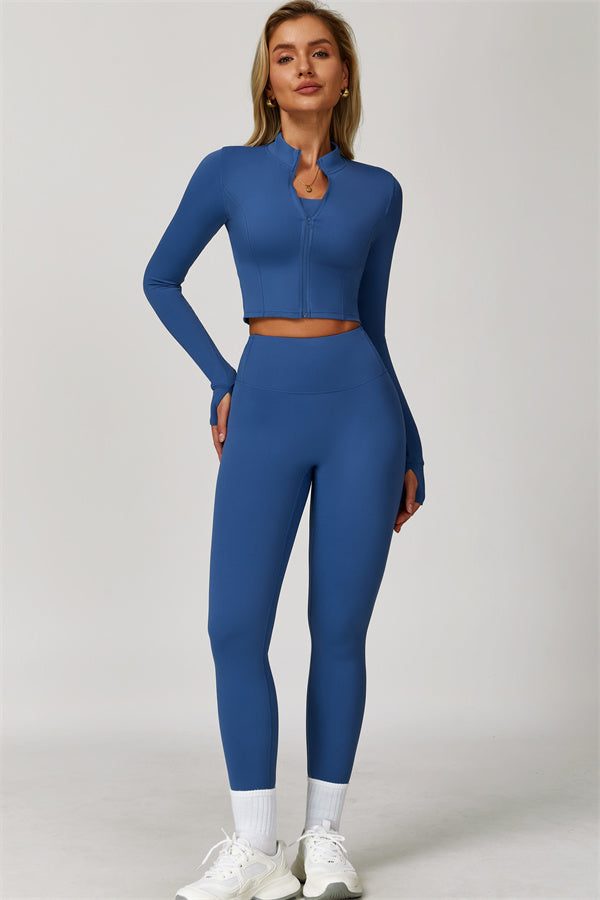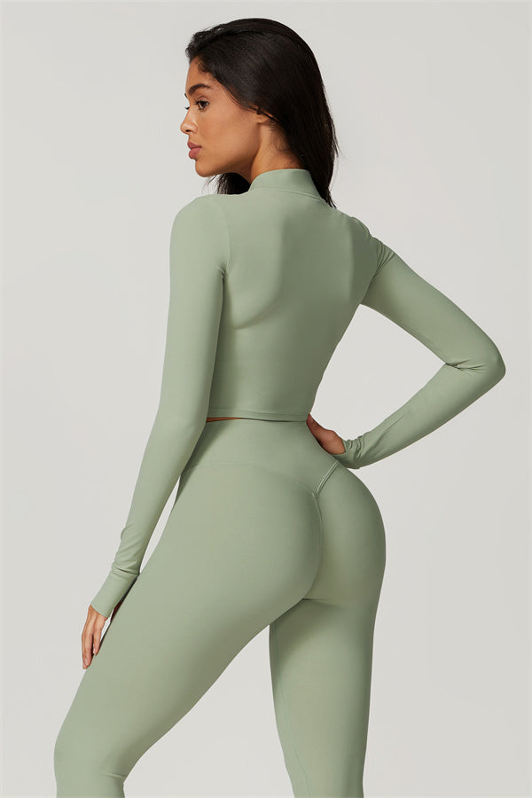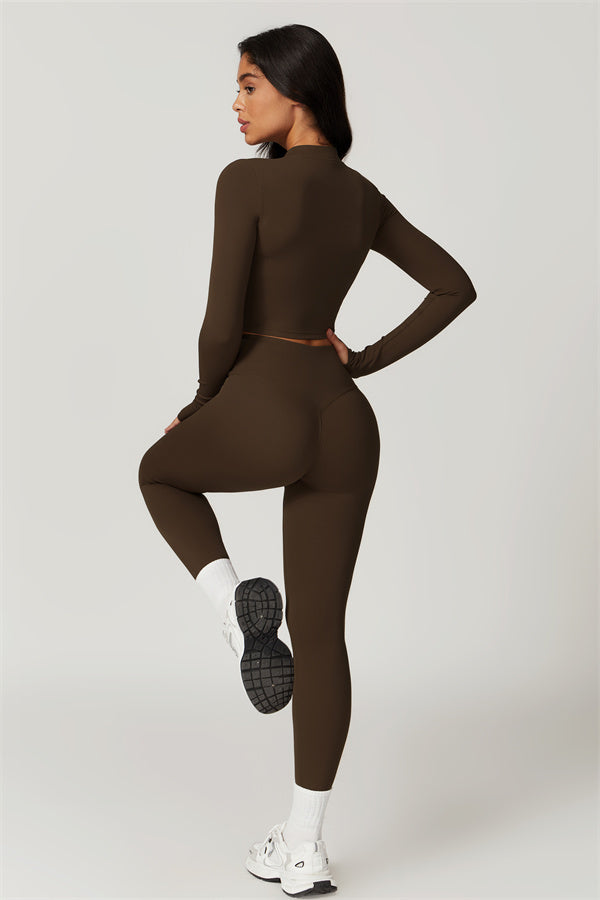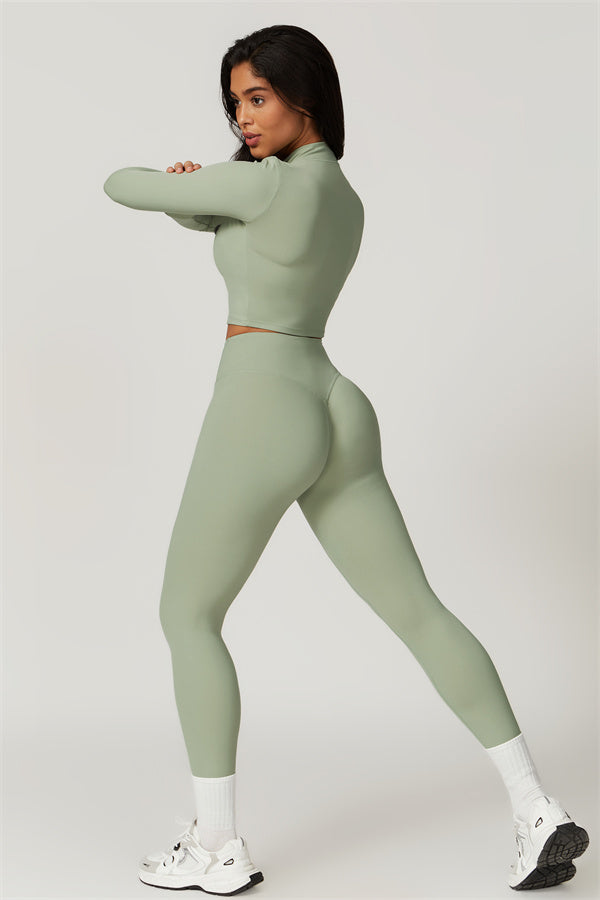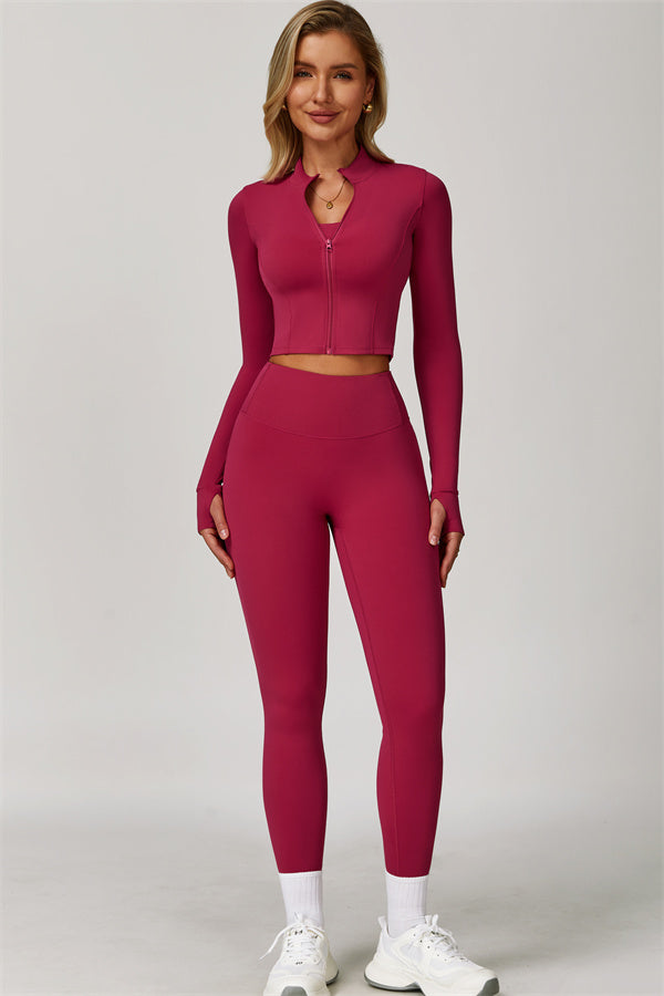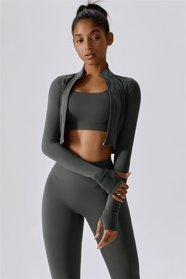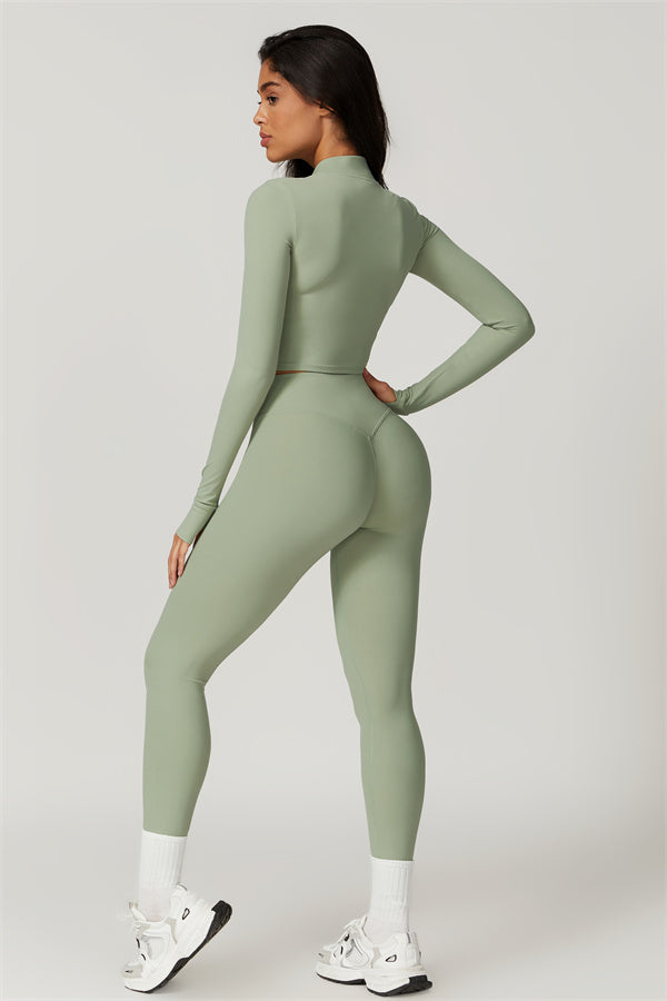 Eleva il tuo abbigliamento sportivo con questo set coordinato premium, composto da un reggiseno sportivo, una giacca corta e leggings progettati per prestazioni e stile. Il reggiseno sportivo presenta una cucitura frontale ad arco e spalline larghe a incrocio, offrendo supporto mentre mette in risalto la tua schiena in modo elegante. Abbinalo alla giacca corta, realizzata con un colletto a stand con zip e un taglio alla vita, per un tocco elegante e sportivo al tuo look. I leggings presentano una parte frontale senza cuciture, evitando linee visibili, con dettagli arricciati sul retro per un sollevamento lusinghiero e una forma contornata.