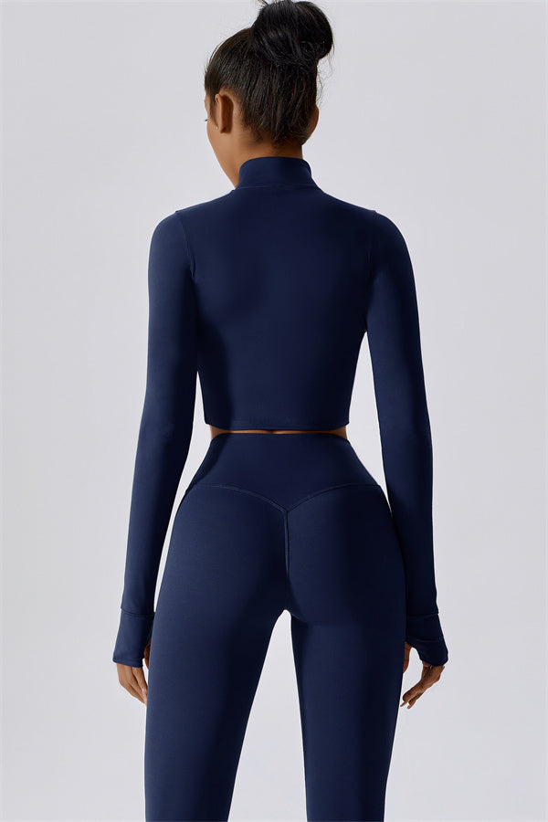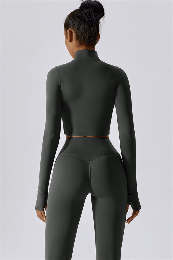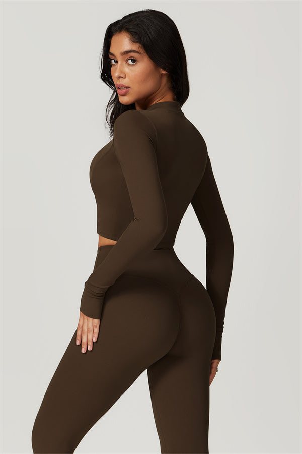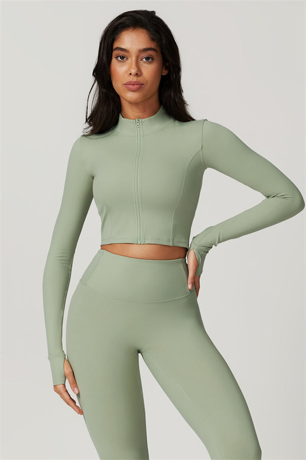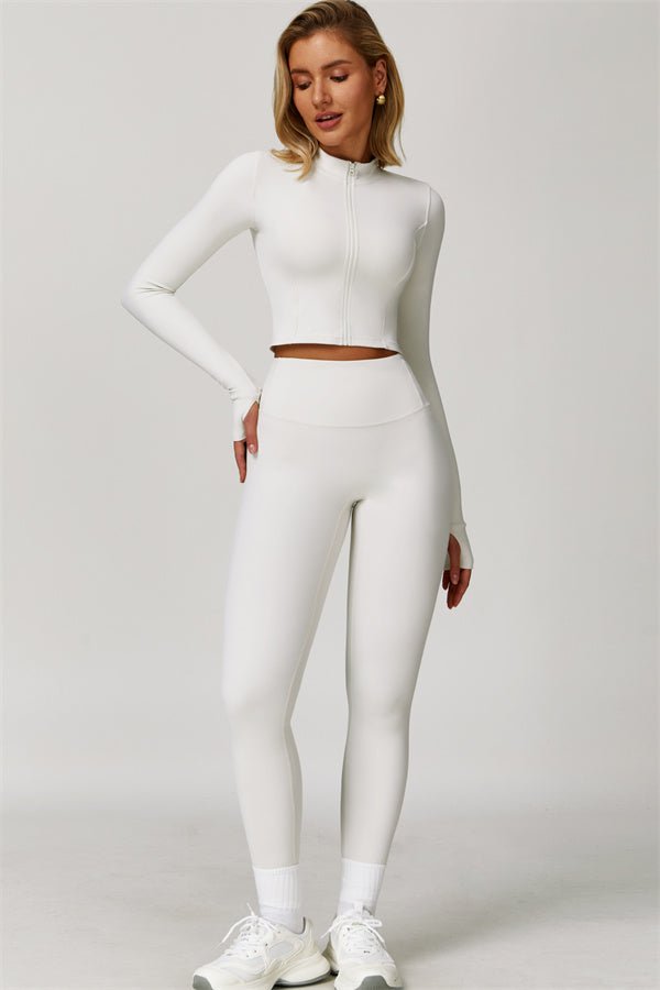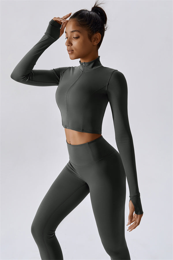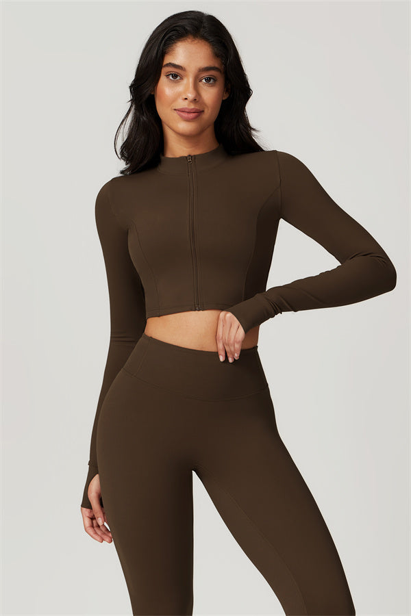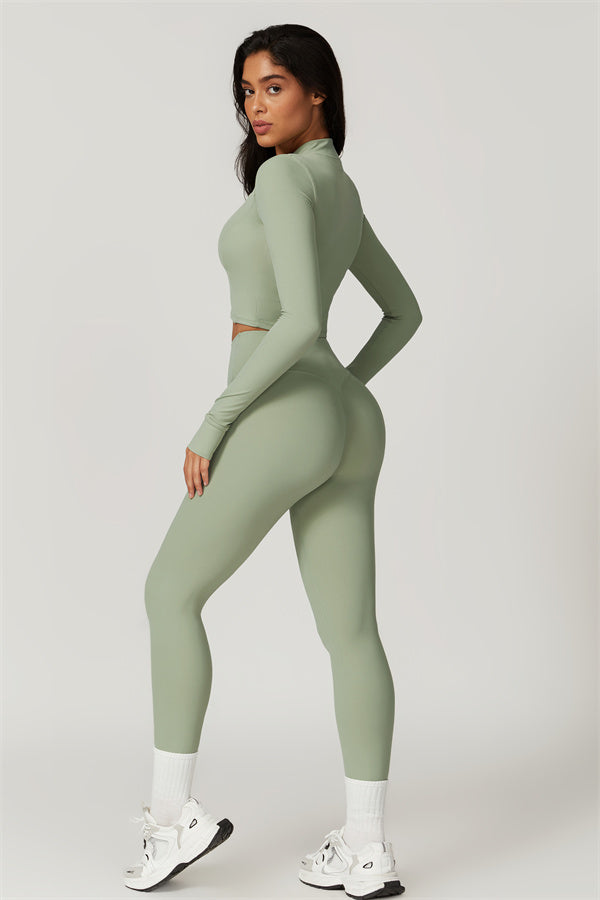 Eleva il tuo abbigliamento sportivo con questo set coordinato premium, composto da un reggiseno sportivo, una giacca corta e leggings progettati per prestazioni e stile. Il reggiseno sportivo presenta una cucitura frontale ad arco e spalline larghe a incrocio, offrendo supporto mentre mette in risalto la tua schiena in modo elegante. Abbinalo alla giacca corta, realizzata con un colletto a stand con zip e un taglio alla vita, per un tocco elegante e sportivo al tuo look. I leggings presentano una parte frontale senza cuciture, evitando linee visibili, con dettagli arricciati sul retro per un sollevamento lusinghiero e una forma contornata.