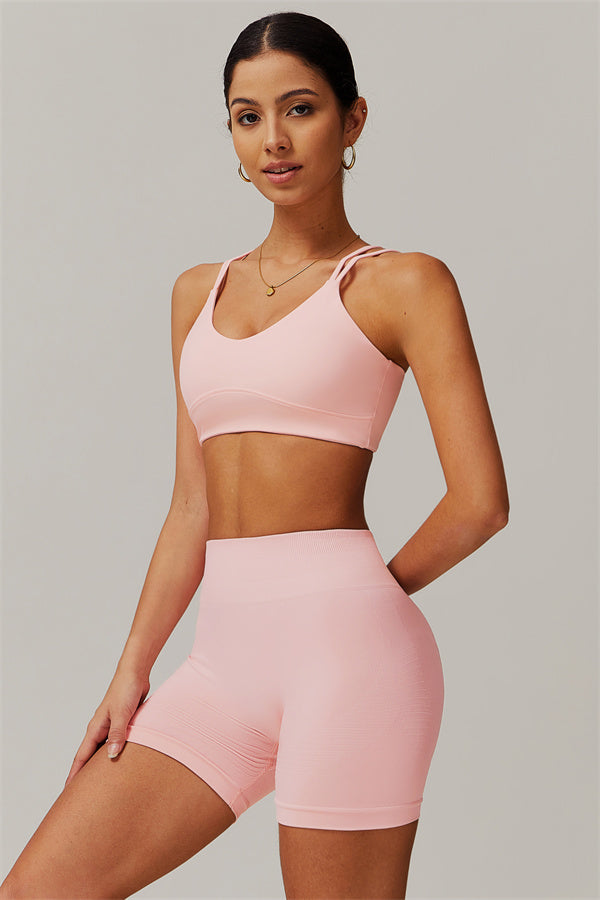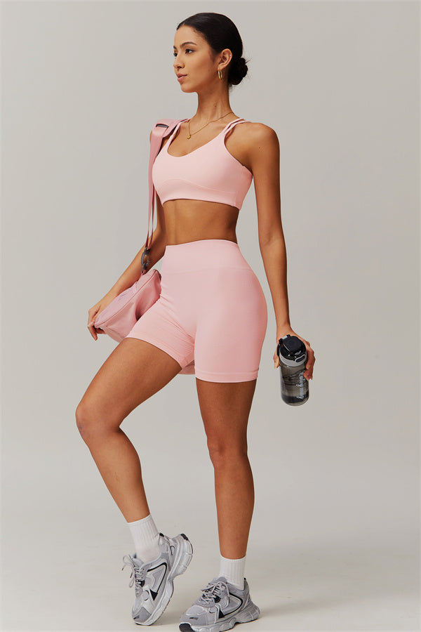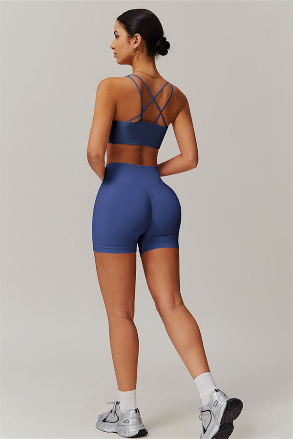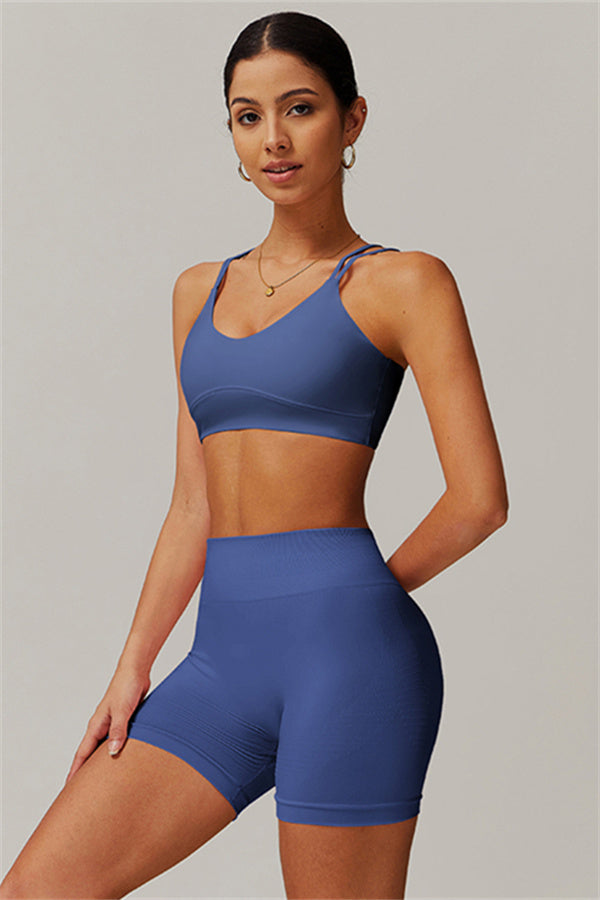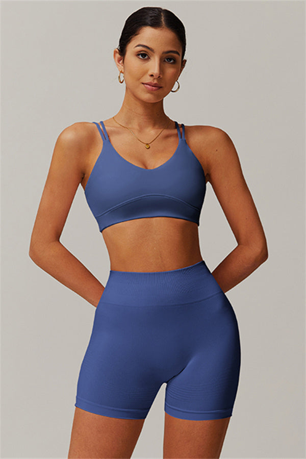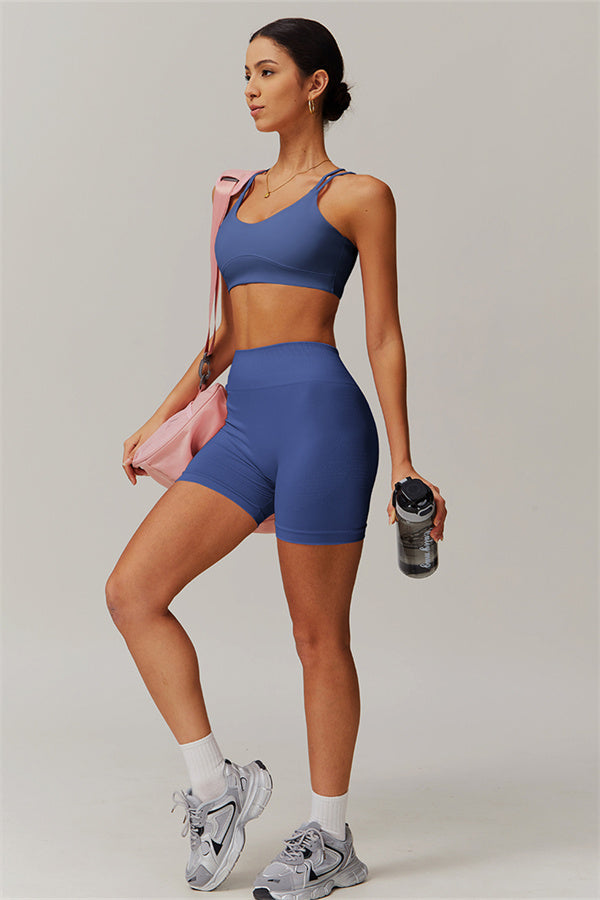 Fai girare la testa con questo straordinario set coordinato, progettato per combinare stile, comfort e prestazioni. Caratterizzato da un reggiseno sportivo e pantaloni corti, questo set scolpisce la tua figura offrendo un supporto e una funzionalità eccezionali.