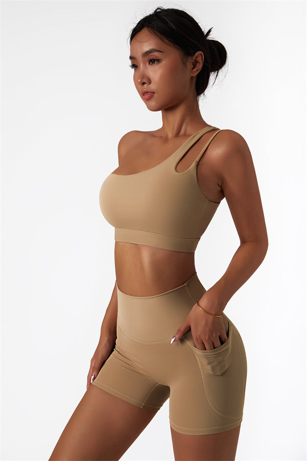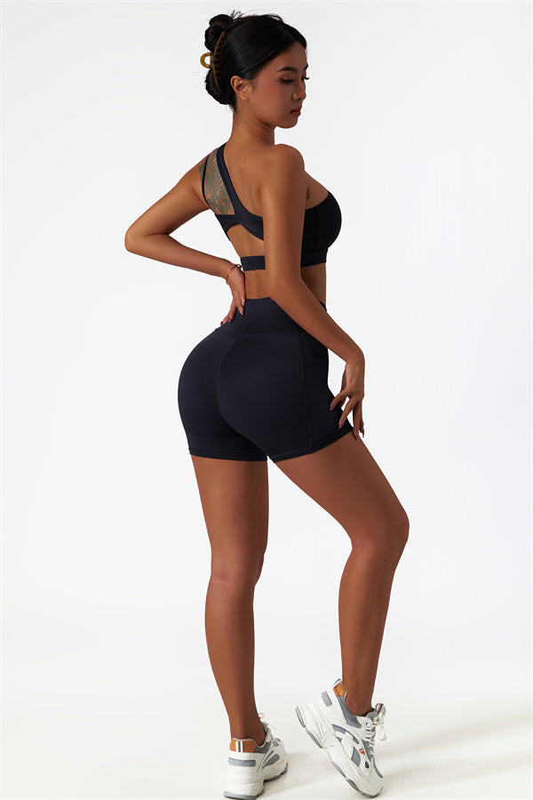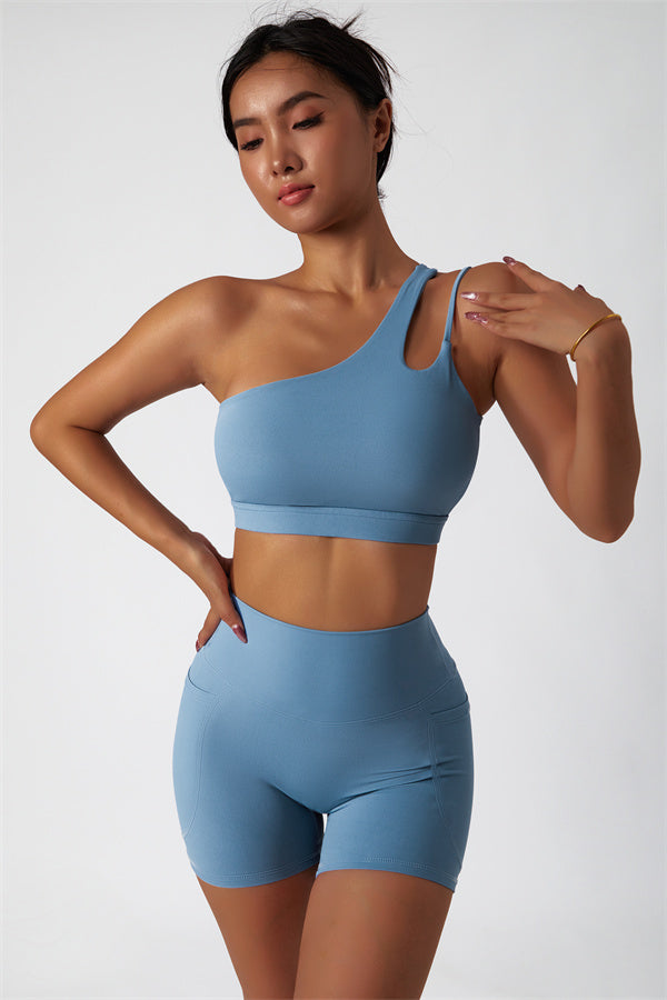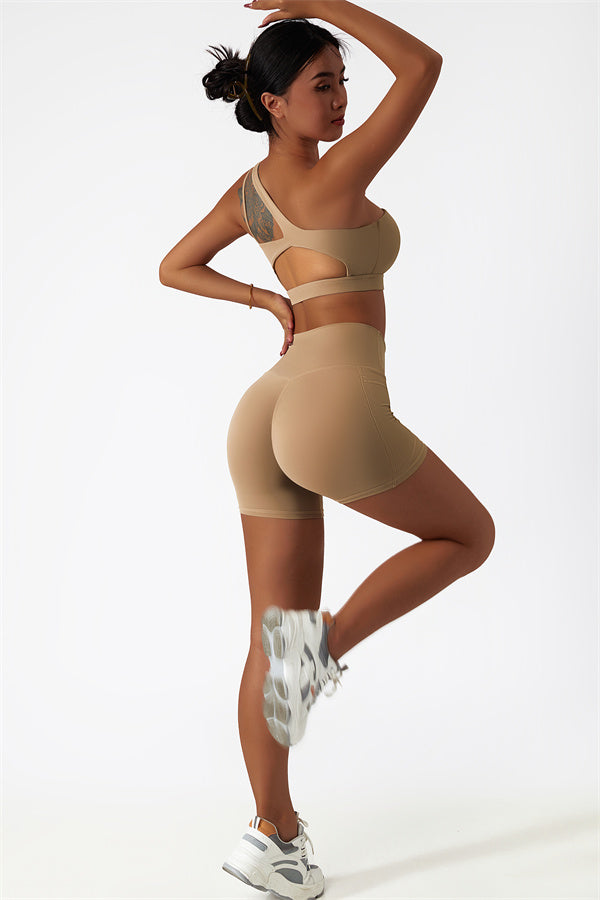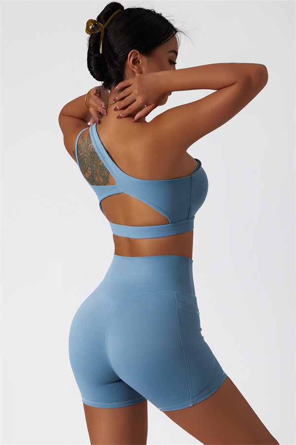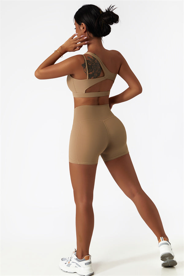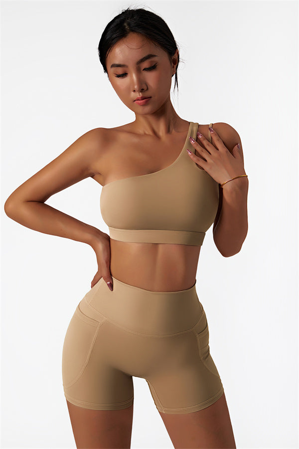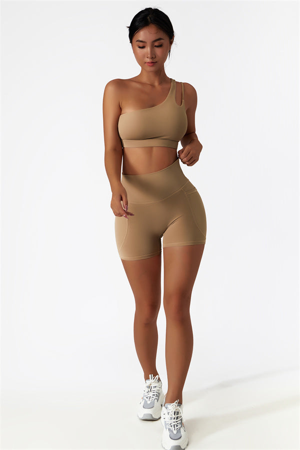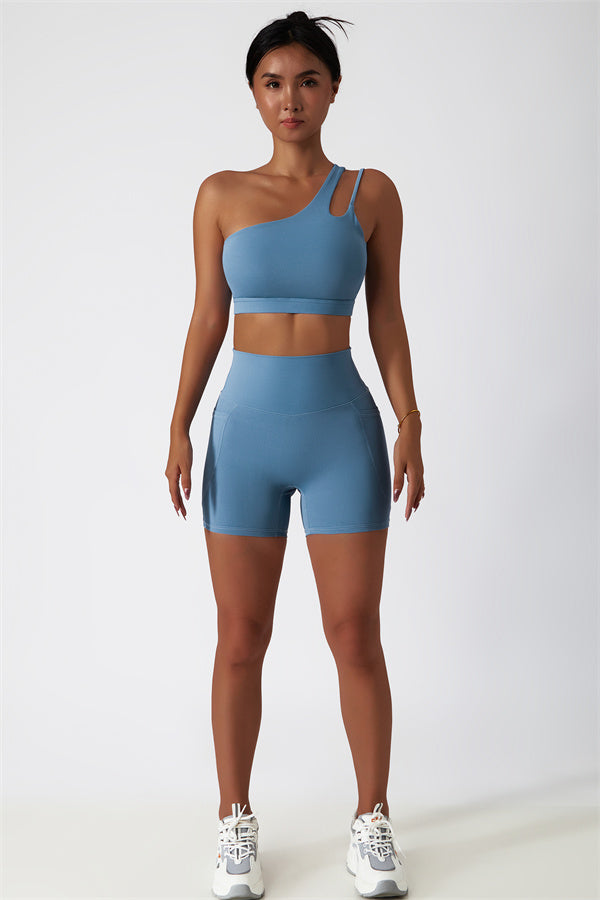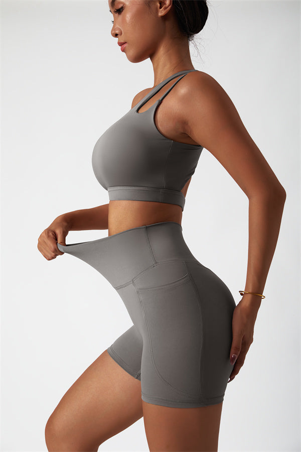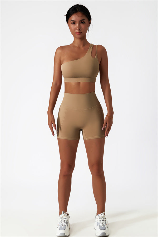 Eleva la tua collezione di abbigliamento sportivo con questo set abbinato elegante e funzionale, composto da un reggiseno sportivo e shorts. Il reggiseno sportivo presenta un design asimmetrico a spalla unica, aggiungendo un tocco di modernità mentre offre un supporto confortevole. Gli shorts sono progettati con tasche laterali, esaltando le tue curve e creando un aspetto lusinghiero e fruttato.