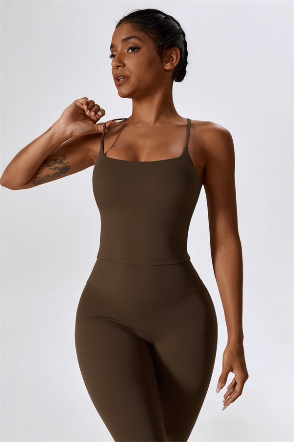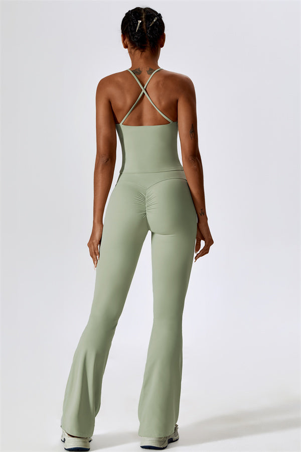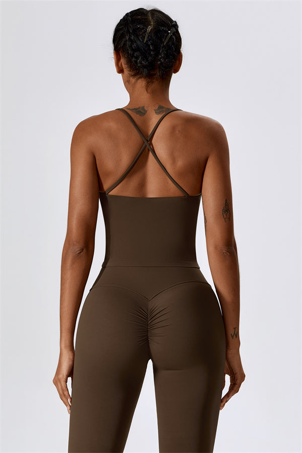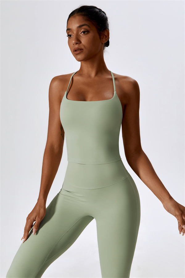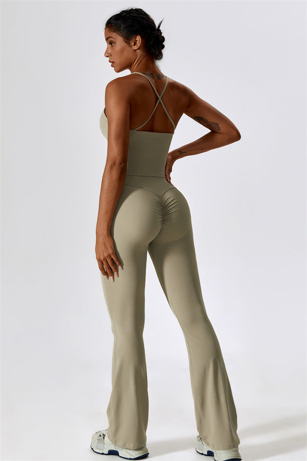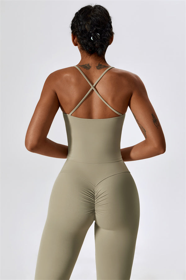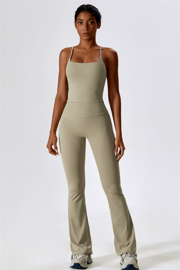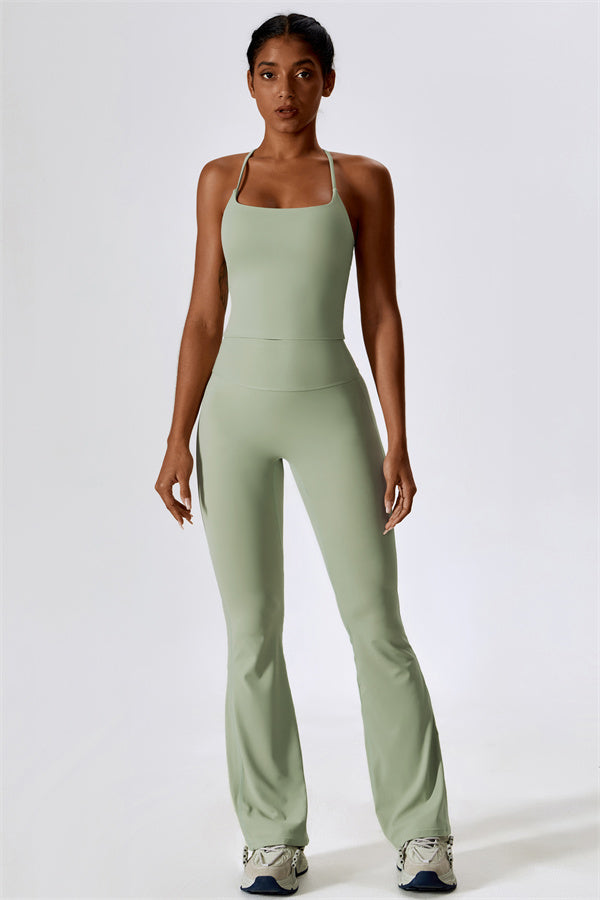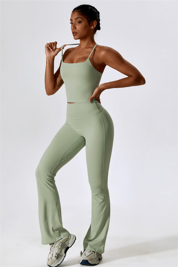 Questo set coordinato, che include un top corto e leggings, combina comfort, stile e prestazioni per l'ensemble perfetto per l'allenamento. Il top corto presenta un orlo allungato per un effetto di controllo della pancia confortevole e delicato, e le spalline incrociate mettono in risalto magnificamente la tua schiena. I leggings sono progettati con una silhouette a campana che valorizza la forma delle tue gambe, mentre il design scolpito sul retro enfatizza le tue curve naturali, creando una silhouette liscia e morbida.