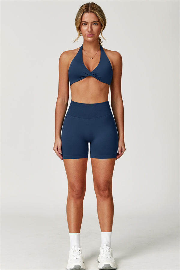 Un perfetto mix di stile, comfort e prestazioni, il Set Elara presenta un elegante top sportivo con un design a torsione che esalta la figura e pantaloni corti a vita alta che offrono completa libertà di movimento. Ideale per allenamenti o uscite informali, questo set ha tutto ciò che serve.
