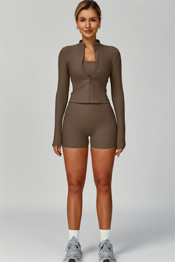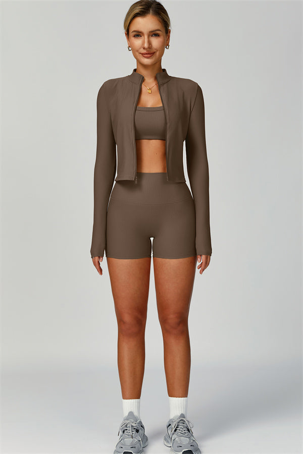 Rimani elegante e protetto con il Set Burst, perfetto per le corse all'aperto e le sessioni di fitness. Questo set coordinato presenta una giacca aderente con dettagli funzionali e pantaloni corti a vita alta progettati per scolpire e garantire comfort.