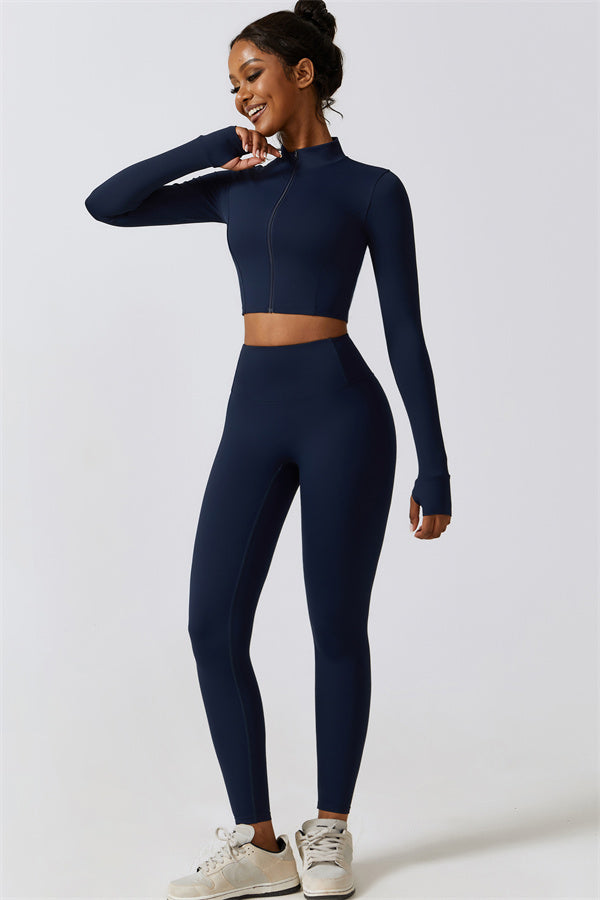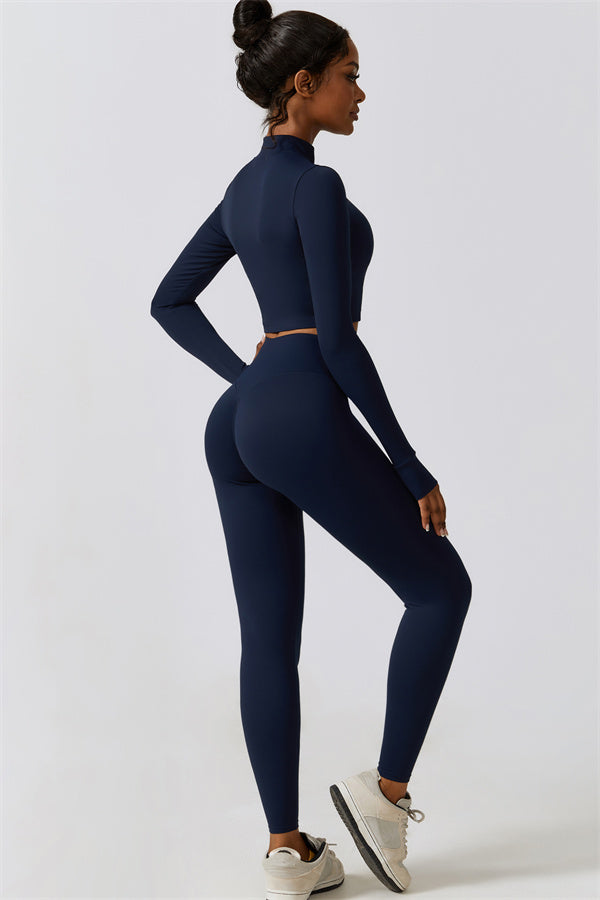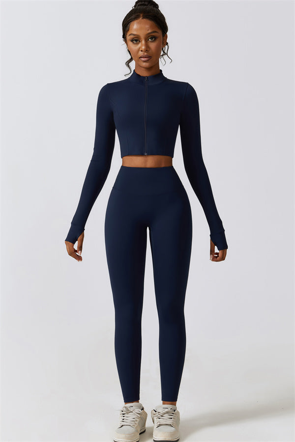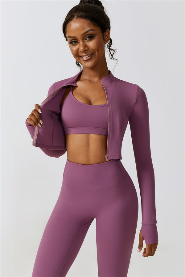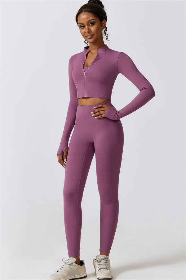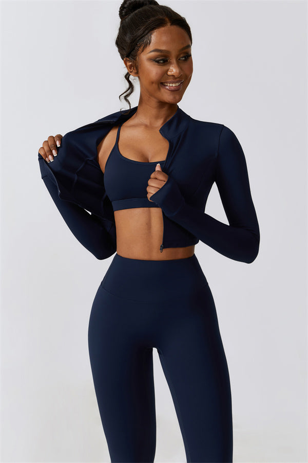Questo set coordinato, composto da un reggiseno sportivo, una giacca e leggings, è progettato per elevare le tue prestazioni e il tuo stile. Il reggiseno sportivo presenta cuciture curve lungo la parte anteriore, migliorando e sostenendo la tua forma con un sollevamento naturale e lusinghiero. I leggings sono progettati con un dettaglio arricciato sul retro che si adatta senza sforzo per creare un aspetto scolpito e tonico. Realizzato in tessuto durevole e resistente, questo set è costruito per mantenere la sua forma, offrendo massima flessibilità e resistenza all'usura.