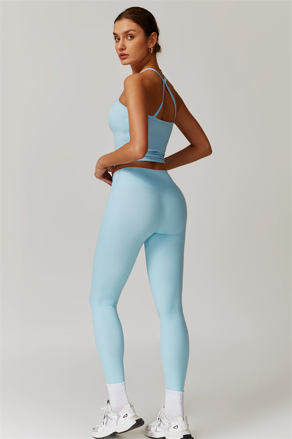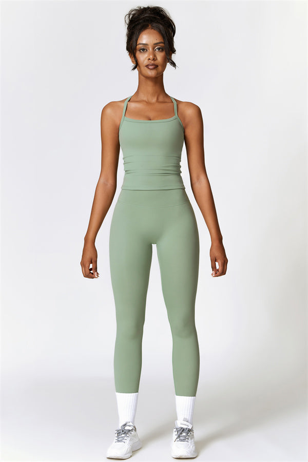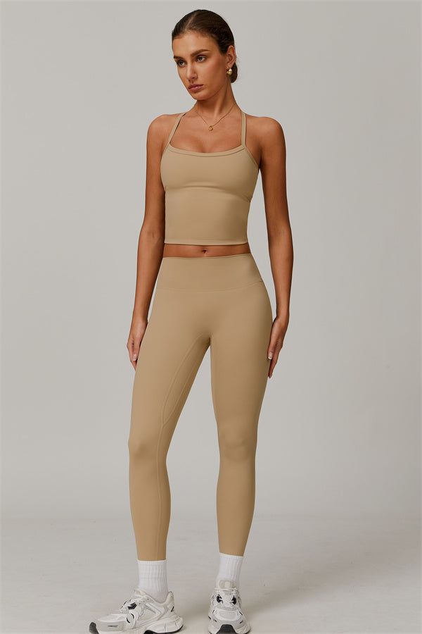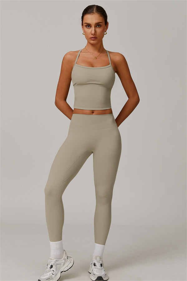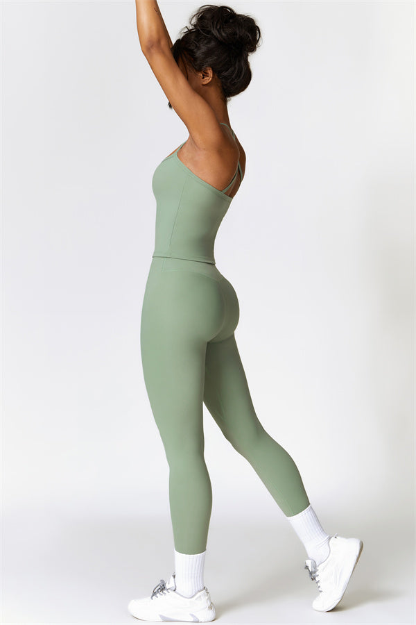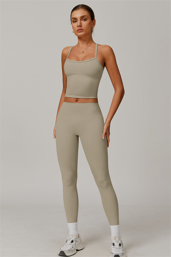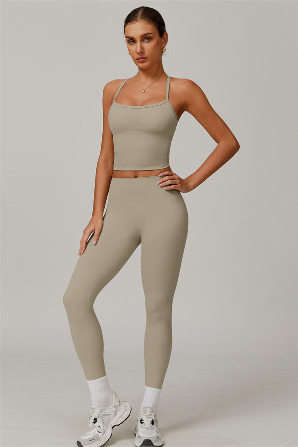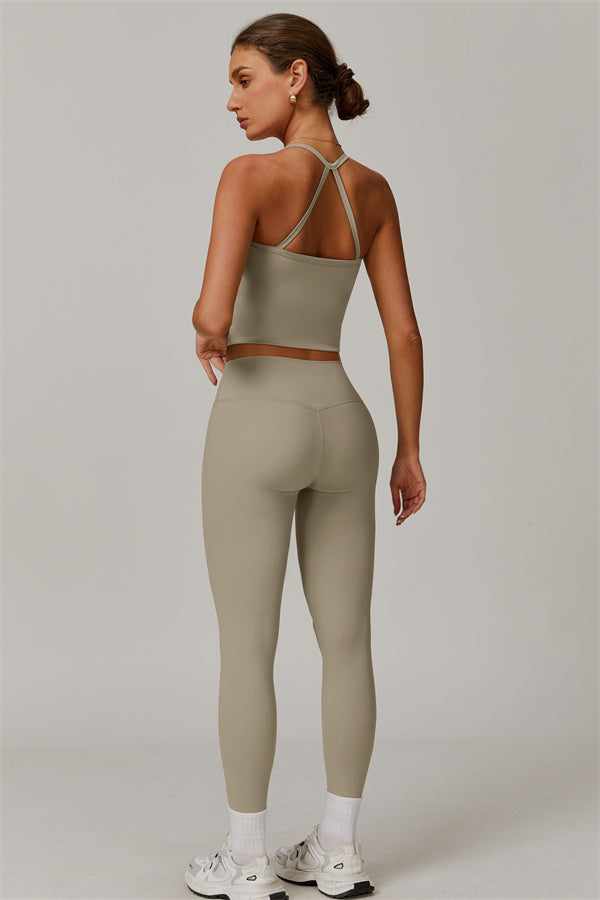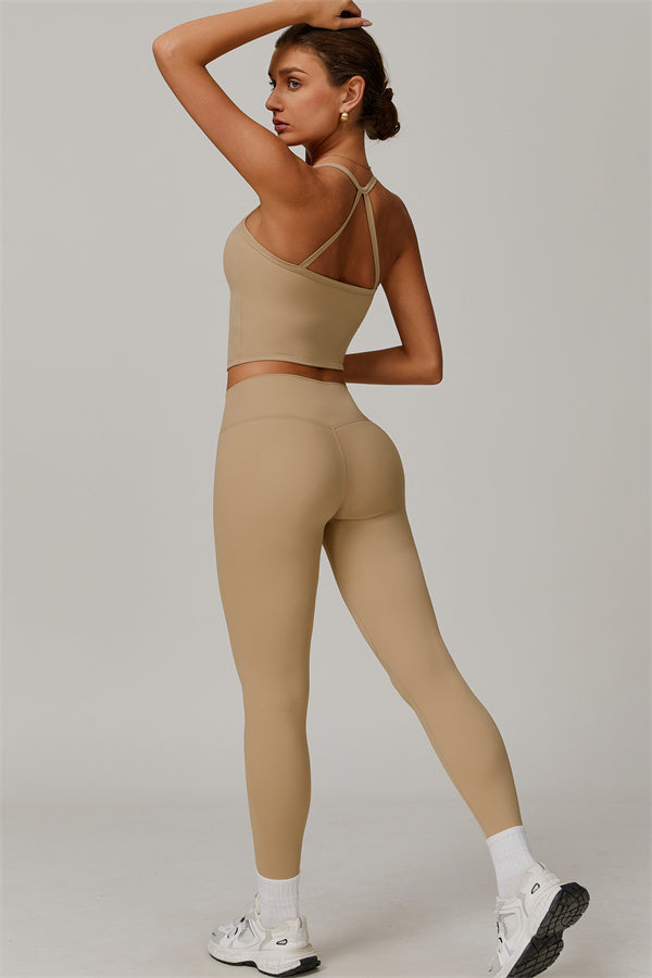 Questo set coordinato, composto da un crop top e leggings, è progettato per migliorare sia lo stile che le prestazioni. Il crop top vanta un delicato design incrociato sulla schiena con spalline sottili, scolpendo e mettendo in risalto le curve naturali della schiena. Il suo tessuto traspirante e che assorbe l'umidità ti mantiene fresca e asciutta, mentre il design a contorno lusinghiero dei leggings crea senza sforzo un retro scolpito e tonico.