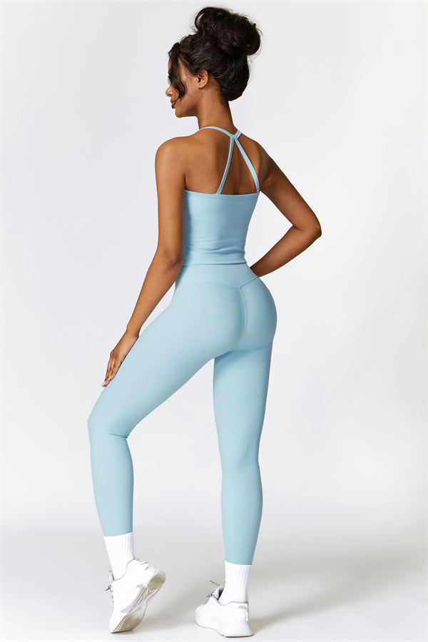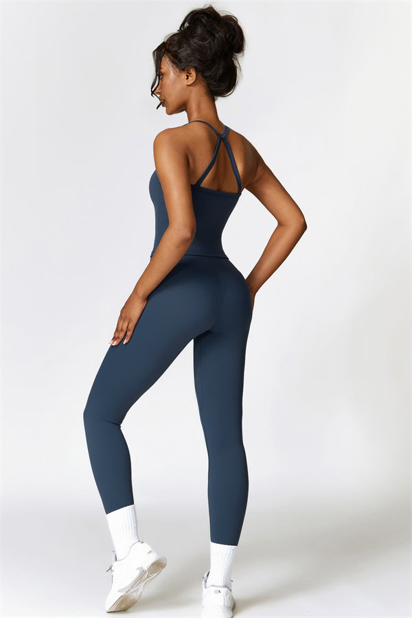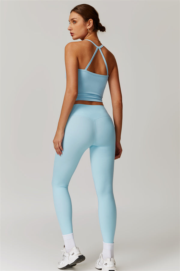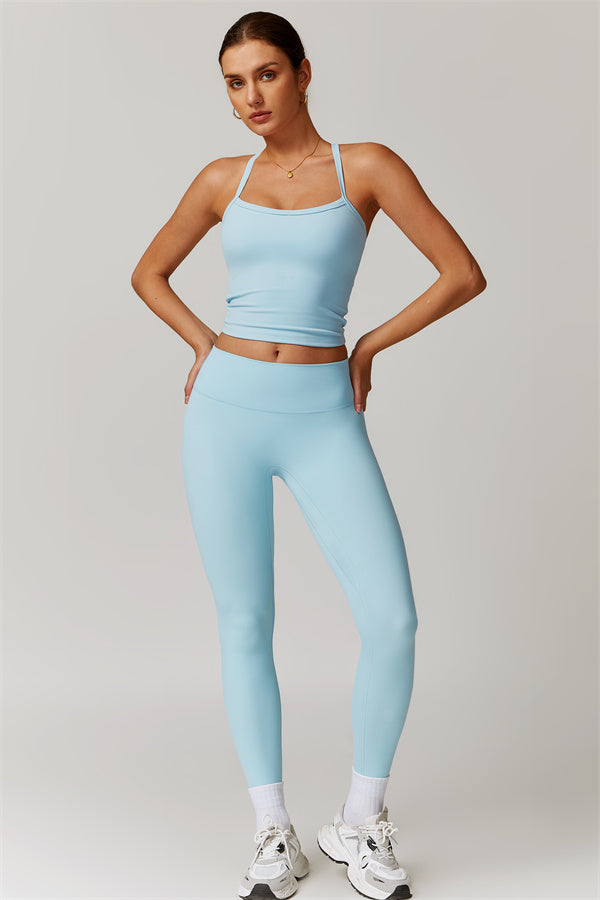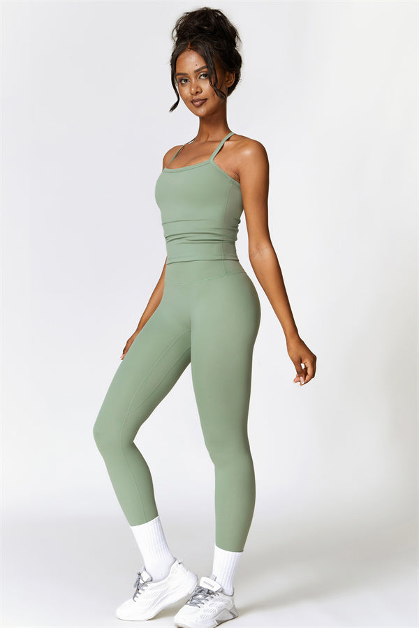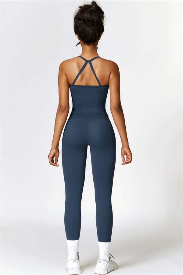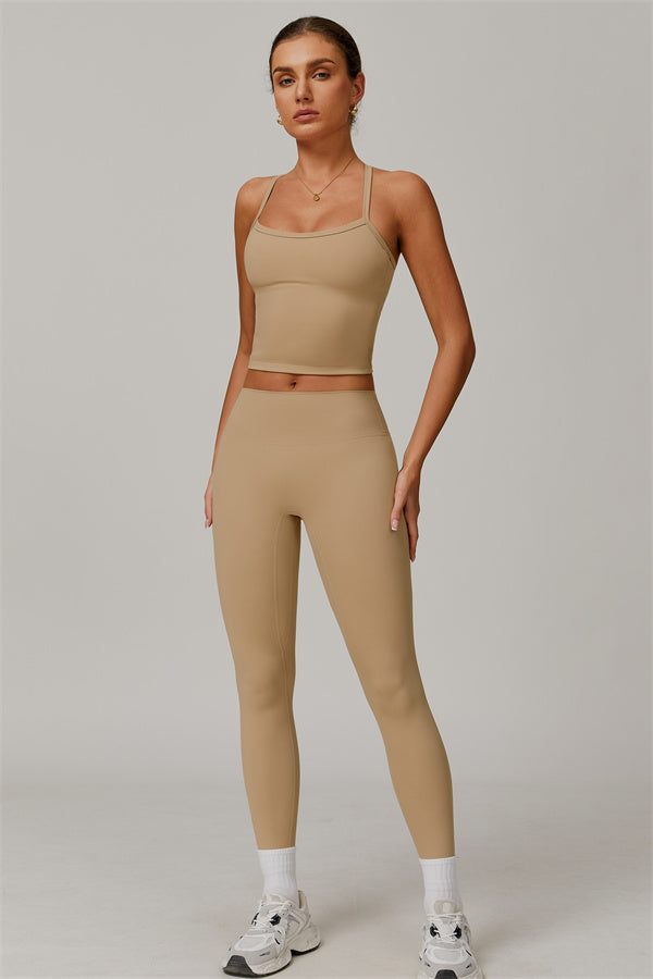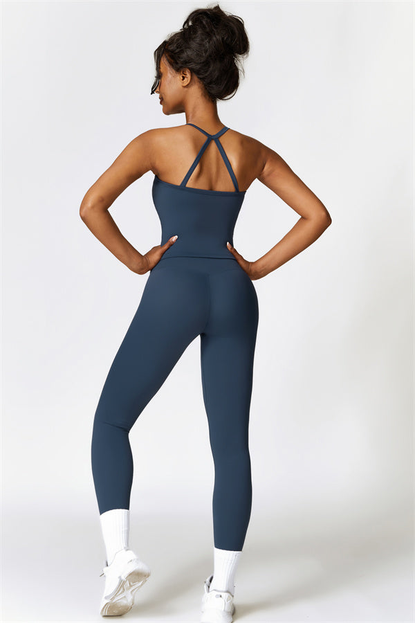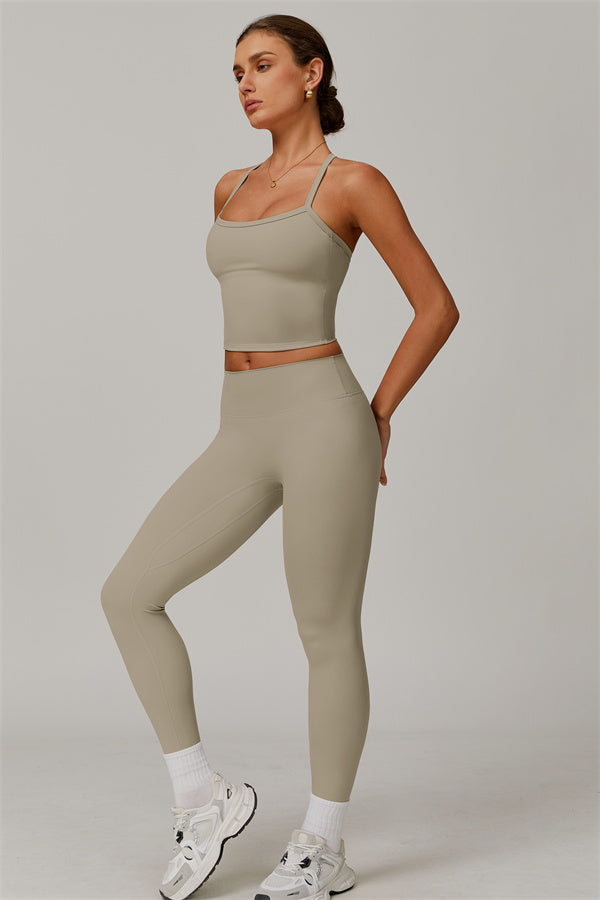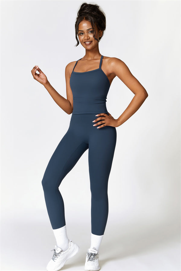 Questo set coordinato, composto da un crop top e leggings, è progettato per migliorare sia lo stile che le prestazioni. Il crop top vanta un delicato design incrociato sulla schiena con spalline sottili, scolpendo e mettendo in risalto le curve naturali della schiena. Il suo tessuto traspirante e che assorbe l'umidità ti mantiene fresca e asciutta, mentre il design a contorno lusinghiero dei leggings crea senza sforzo un retro scolpito e tonico.