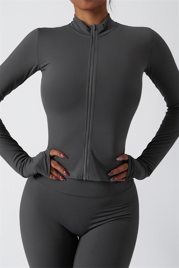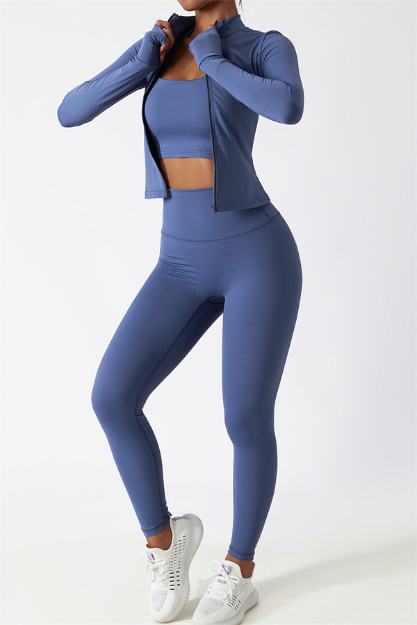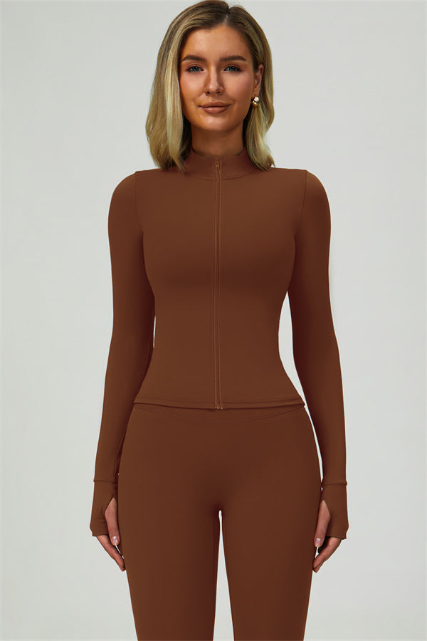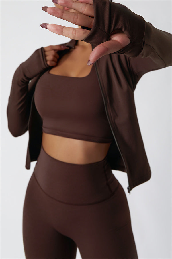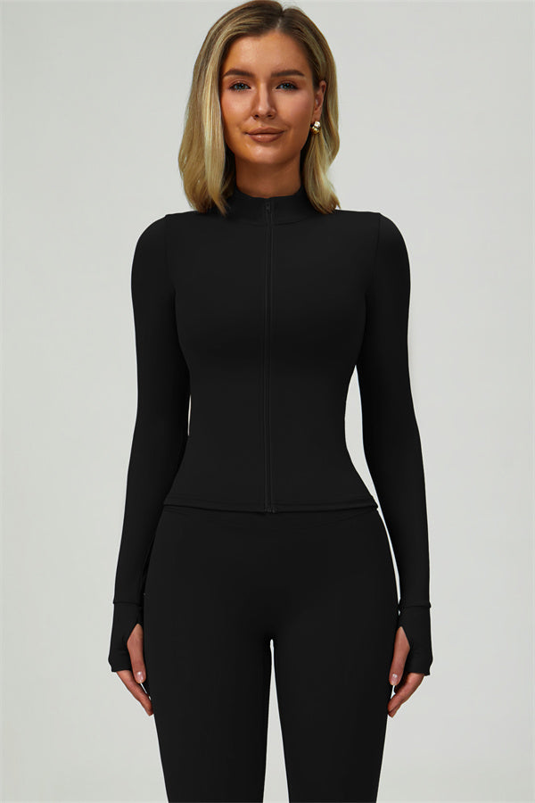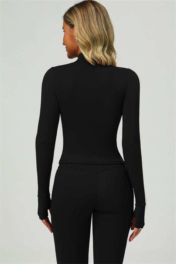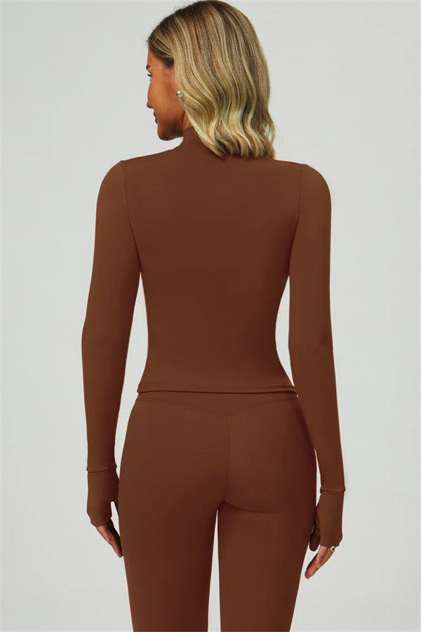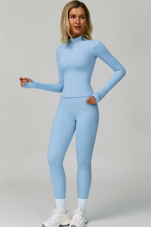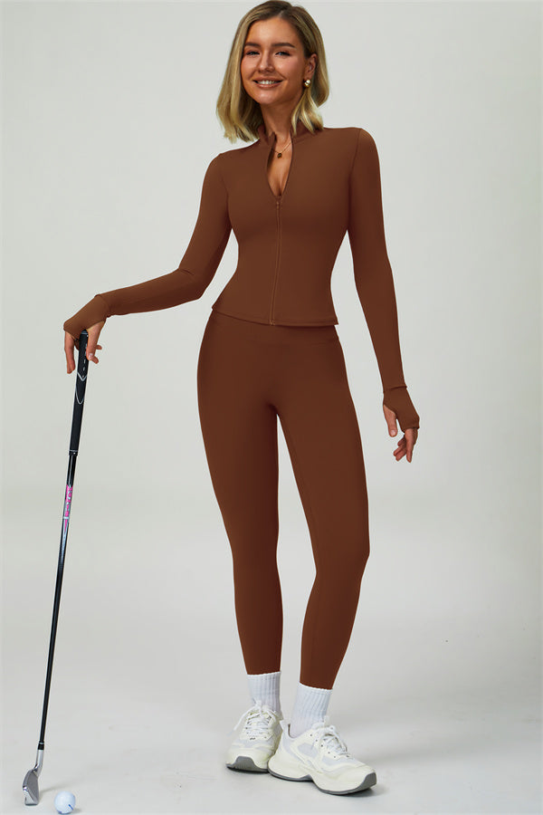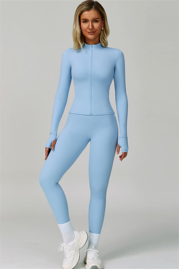 Questo set coordinato presenta una maglietta a maniche lunghe con polsini allungati e aperture per il pollice, aggiungendo un tocco di stile funzionale mentre mantiene le mani sicure e calde durante gli allenamenti. La maglietta offre un design elegante e aderente che consente una completa libertà di movimento, assicurandoti di poter muoverti con facilità.