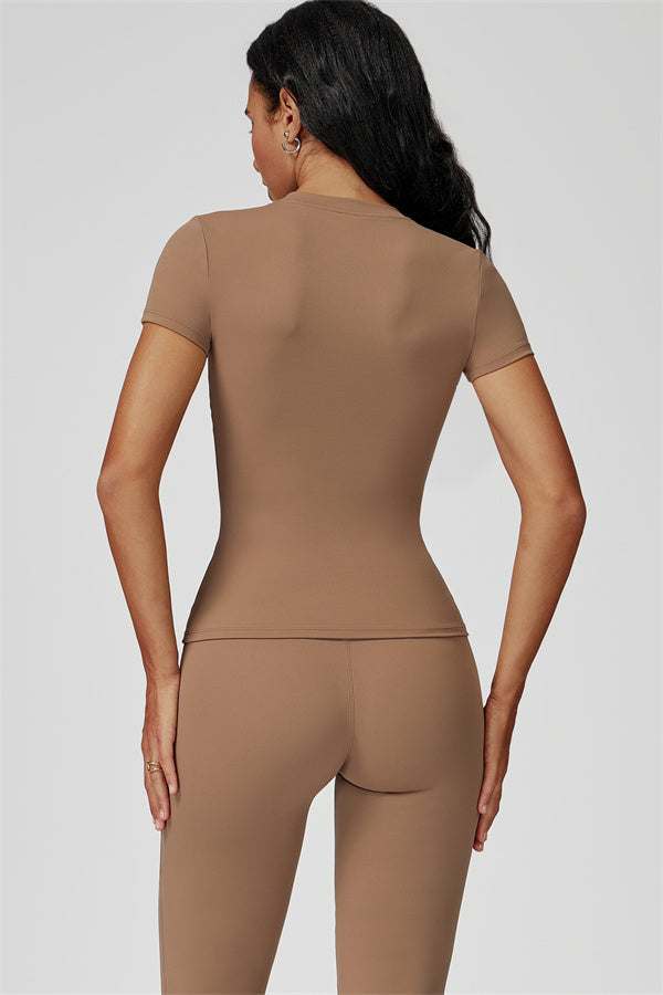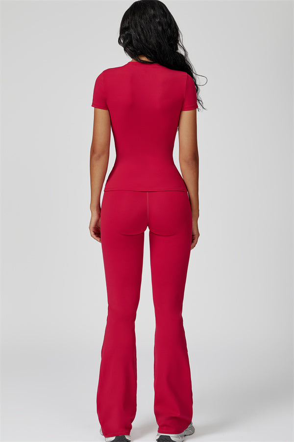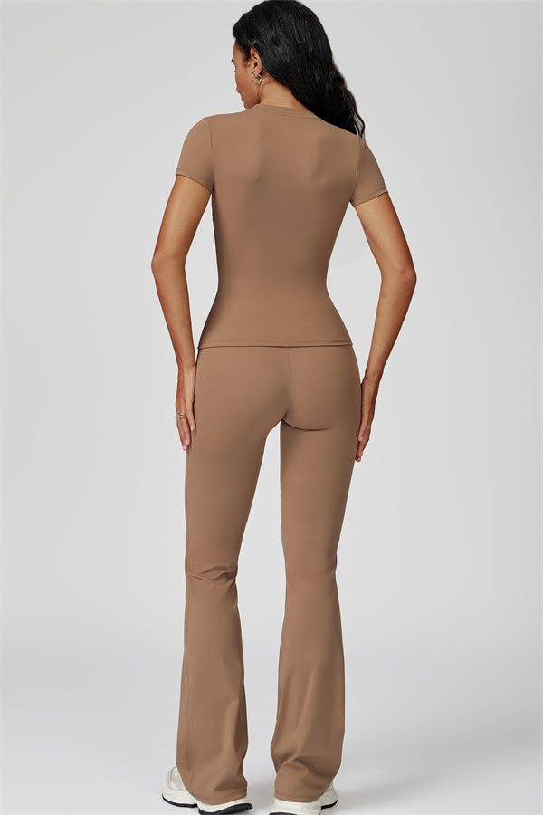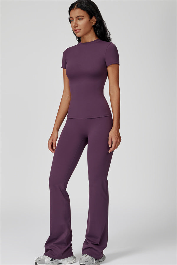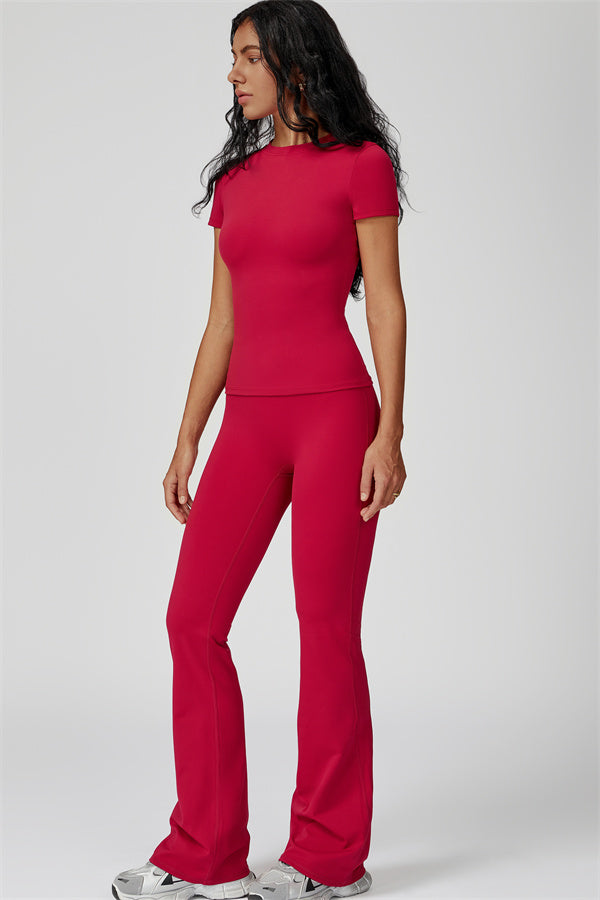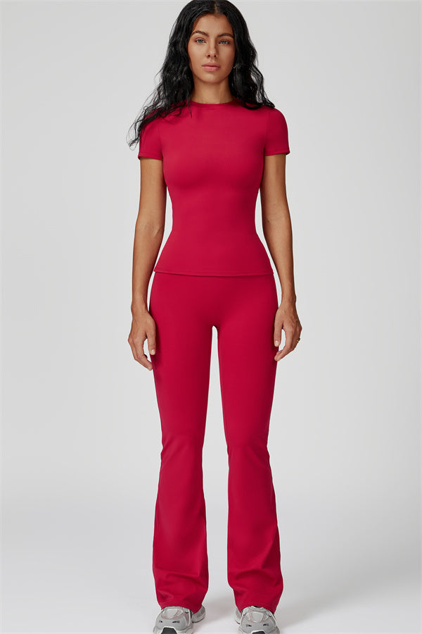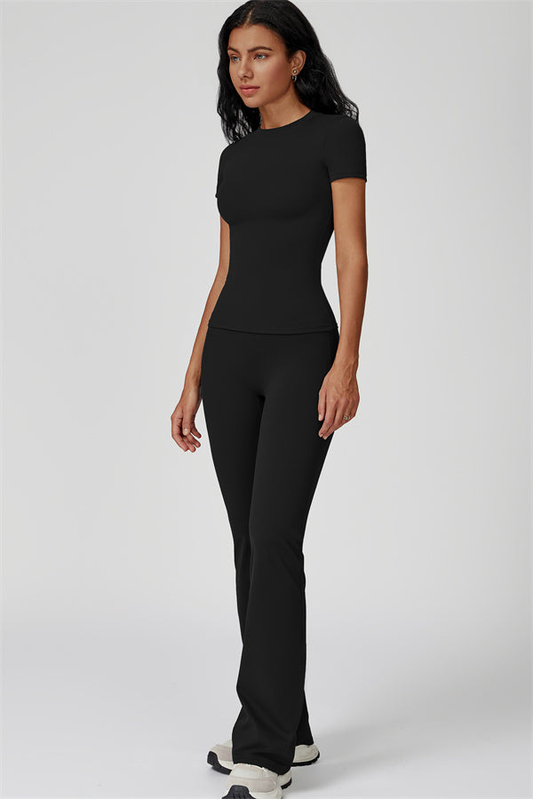Sottile sopra, dichiarativo sotto. Il Set Oasis unisce una t-shirt aderente e scolpente e leggings svasati che esaltano le curve, progettati per contornare il tuo corpo mantenendoti comoda e supportata in ogni movimento.