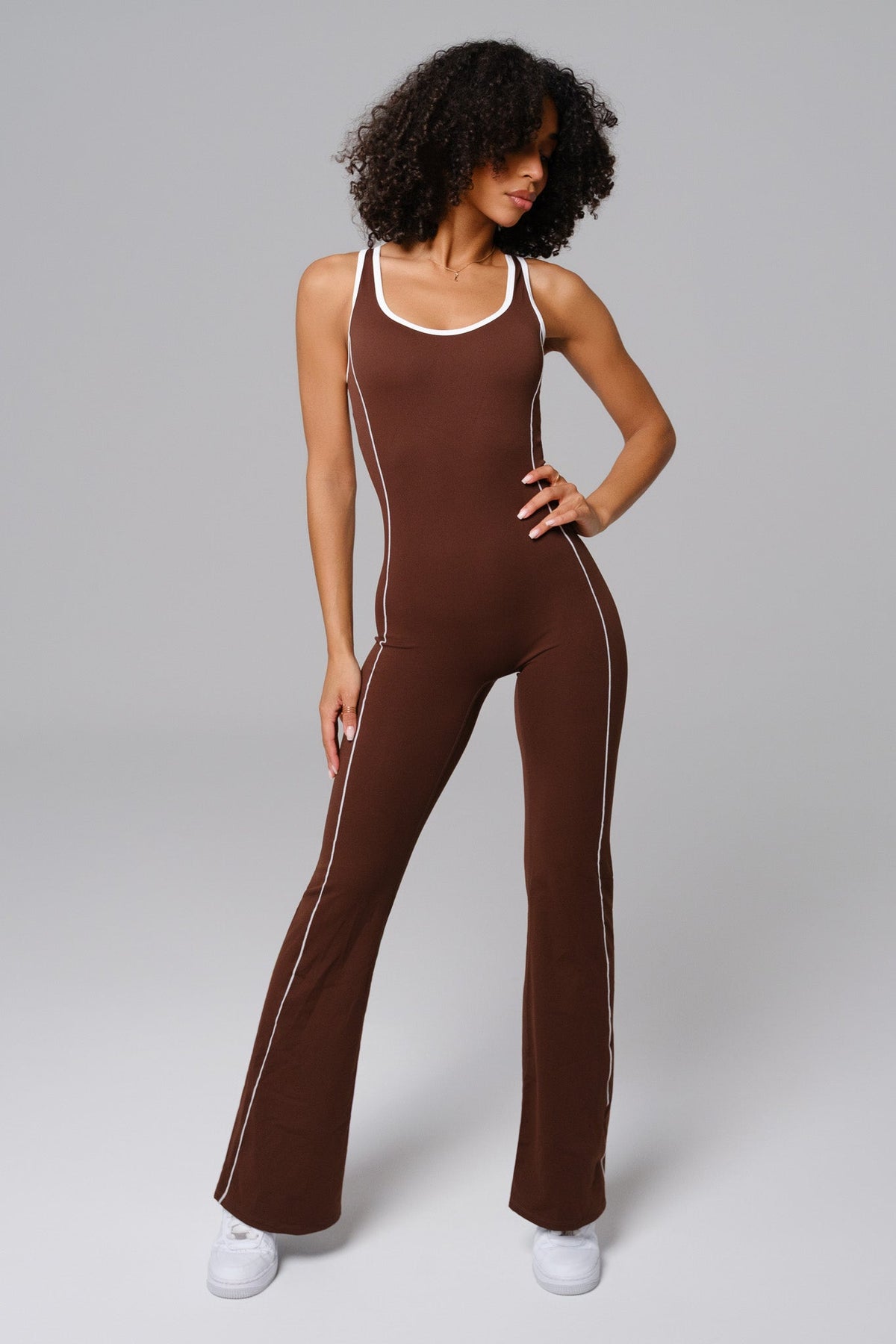 Un elegante tuta intera progettata con piping a contrasto, scollatura a barchetta e gambe svasate per una silhouette lusinghiera. La schiena aperta aggiunge un tocco sportivo mentre il tessuto morbido e elasticizzato si muove con te per un comfort che dura tutto il giorno. Dotata di un reggiseno imbottito rimovibile per un supporto leggero e una vestibilità liscia, rendendola una combinazione senza sforzo di stile e funzionalità.