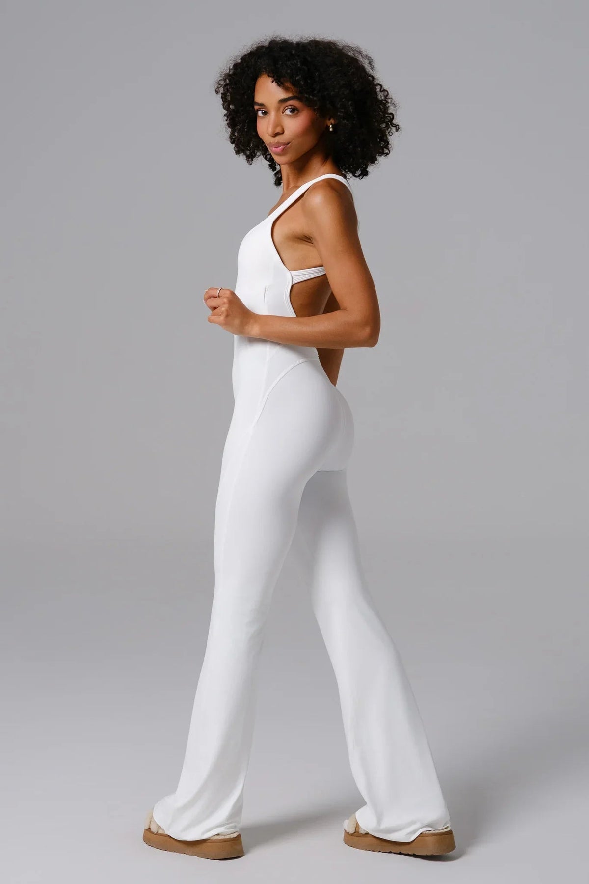 Un jumpsuit a palazzo con scollatura a cuore e schiena scoperta per una silhouette elegante e femminile. Realizzato in tessuto morbido e elasticizzato con reggiseno incorporato e imbottitura removibile per un supporto personalizzabile, il Maya Jumpsuit unisce comfort ed eleganza—perfetto per lo studio, la strada o le uscite serali.