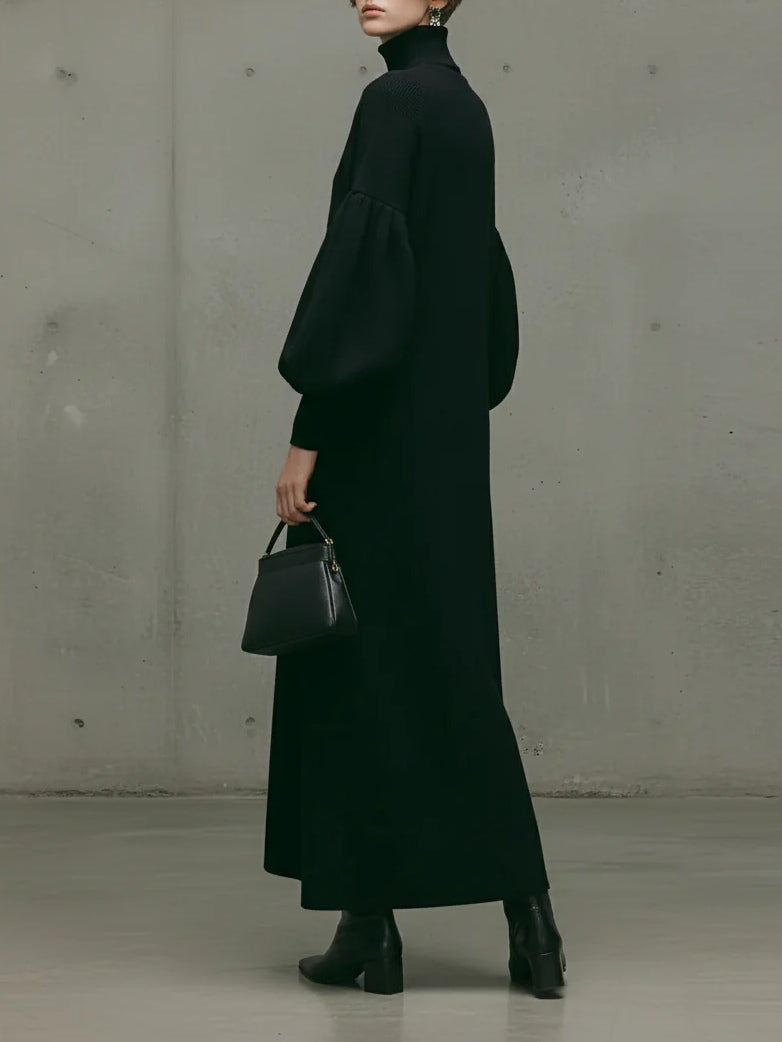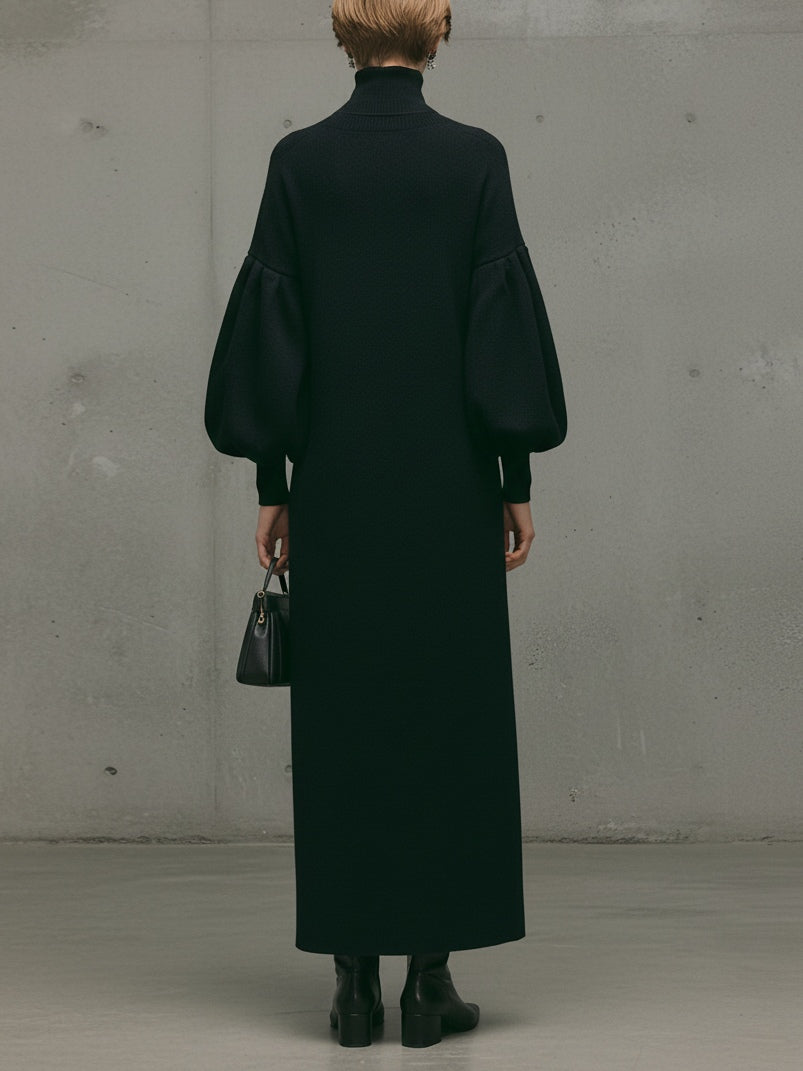 Questo moderno abito nero in maglia presenta un collo alto pulito e maniche a volant scultoree, creando una silhouette sofisticata che mette in risalto un'estetica architettonica discreta.