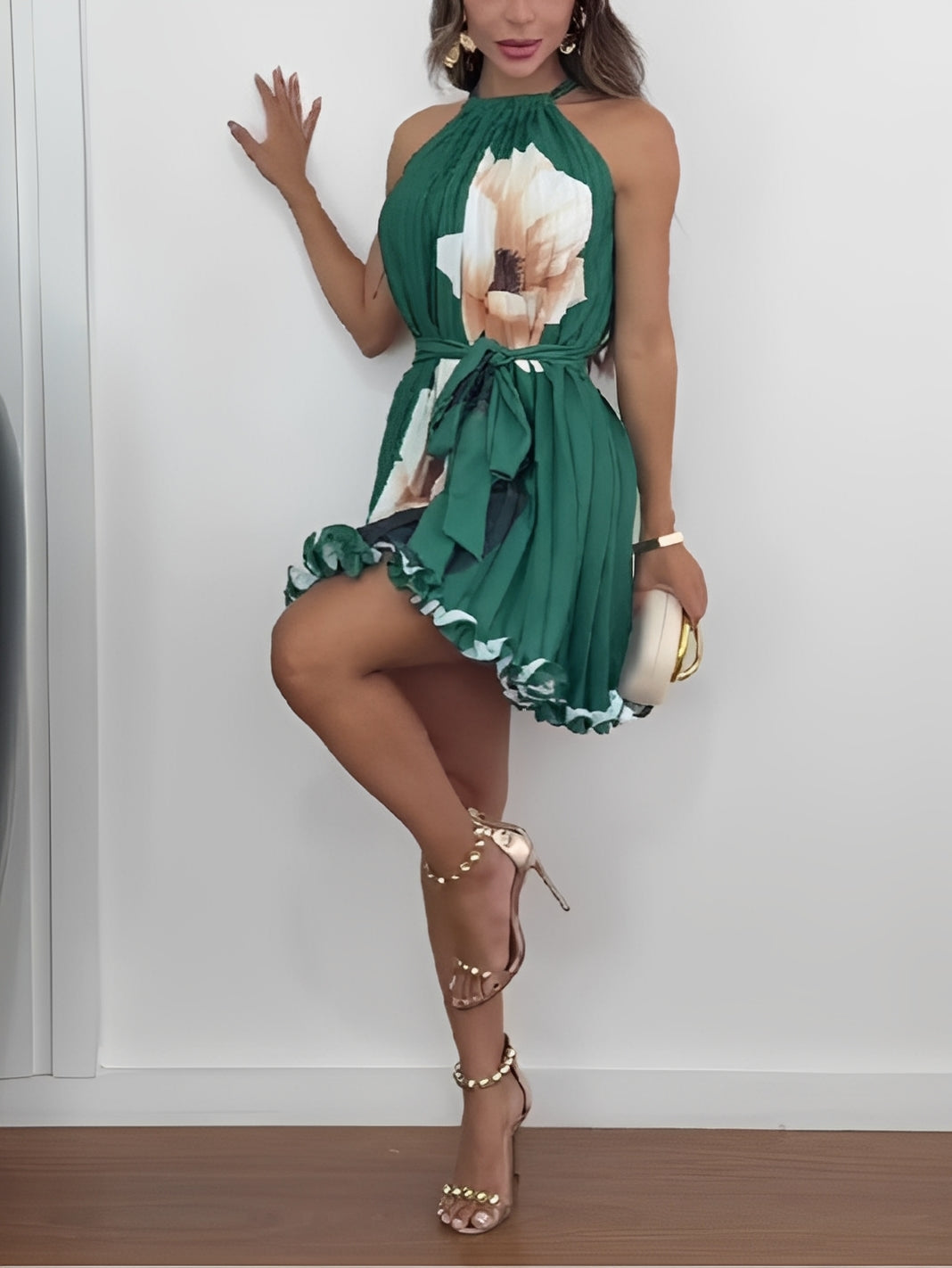Abito Mini a Fiori con Scollo Halter e Pieghe