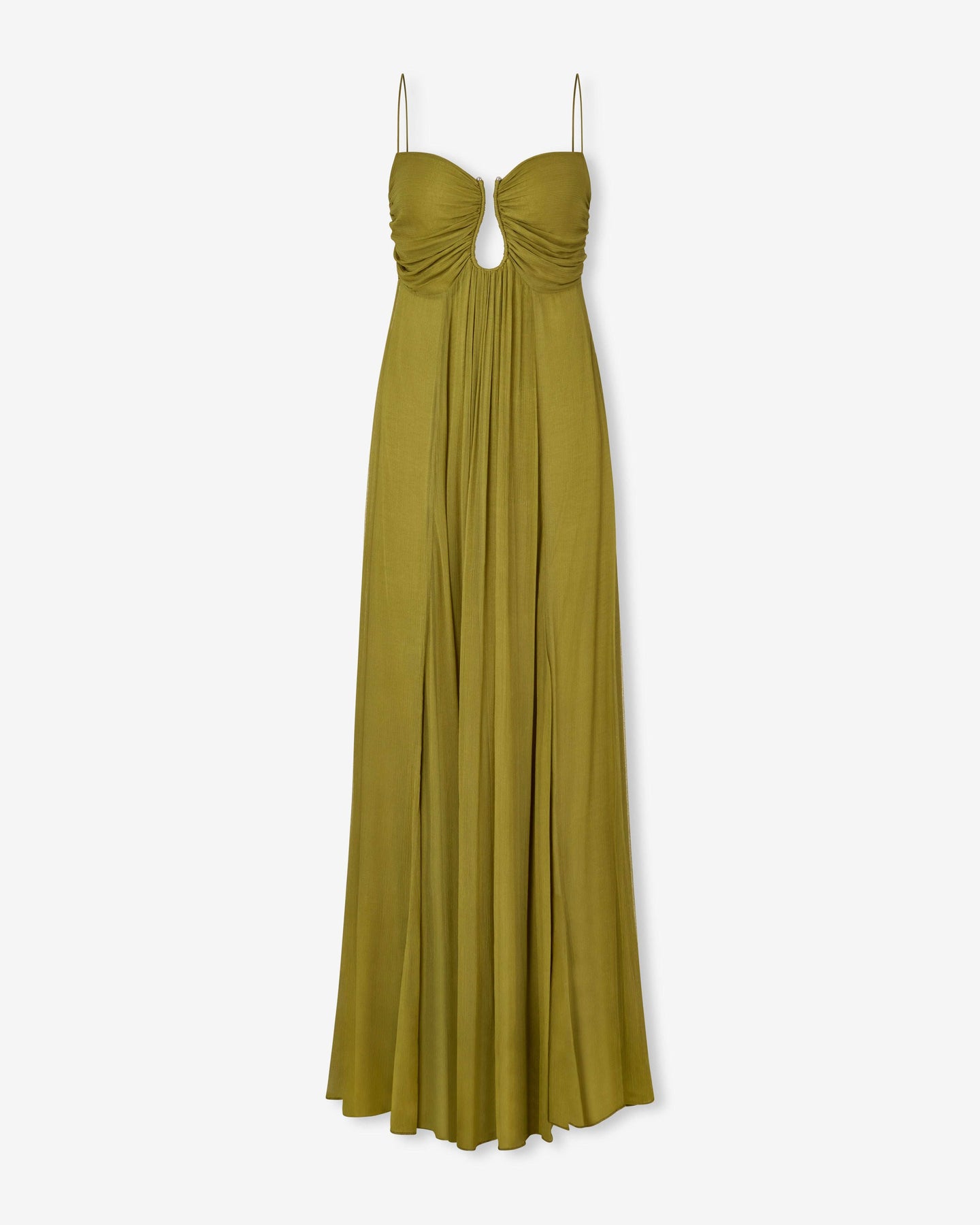 KORA – MAXI DRESS RICAMATO IN OLIVA LAVATO DAL SOLE