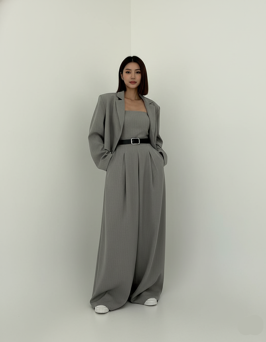 ✓ Stile impeccabile e contemporaneo – Il bustier sagomato esalta la silhouette, mentre la giacca aggiunge un tocco di eleganza strutturata per un look armonioso e di grande impatto.