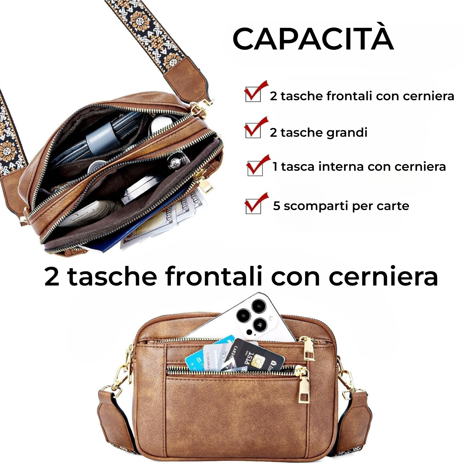 Hovedrum + indvendig lynlåslomme og kortlommer for hurtig orden.