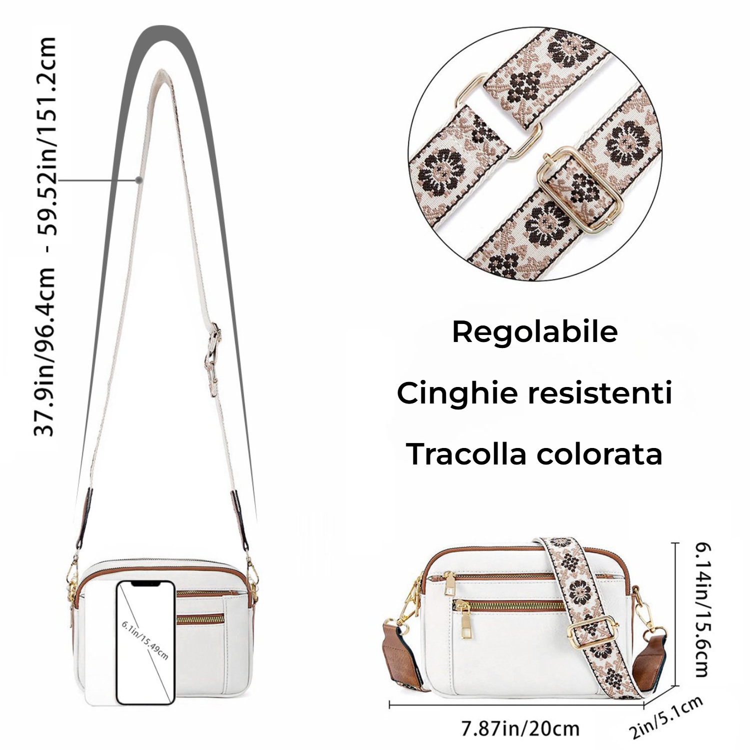 Justerbar rem til skulder eller crossbody for fri bevægelse.